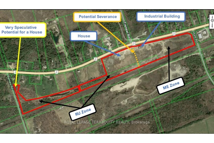 Description14407 County Road 2 is an irregularly shaped property comprising of five adjacent parcels which combine for 25.71-acres (1,119,953 s.f.) and have a combined 2,912 feet of road frontage on County Road 2, Hunt Road, and Barnes Road. The property is zoned for industrial ME-1 as well as RU. Many possibilities exist for rezoning! The main parcel, being 15.94-acres and located in the northeast section of the property, is developed with a house, an industrial style building, and a storage outbuilding. Great panoramic views of Lake Ontario. The 770 s.f. single-story bungalow features a single bedroom and three-piece bathroom. Originally constructed in 1954 it was extensively renovated in 2016. New windows 2022, New roof 2020, New Electrical 2024, New Heat Pump 2023. A new roof was installed in 2020, windows were replaced in 2022. The three-piece bathroom includes a walk-in shower, ceramic bowl sink set in a wooden countertop and frosted windows. The bedroom has a closet and glass patio door providing access to a rear wooden patio deck. The home is serviced by hydro, a septic tank, and a private well. Heating and cooling is provided by an electric heat pump and a supplemental propane fireplace. The 4,091 s.f. single storey industrial style building features two bays, each equipped with a roll-up drive-in door. The front section has a clear height of 24 ft. high, and the rear is 18 ft. Constructed on a poured concrete and concrete block foundation with slab on grade flooring, the exterior walls are primarily comprised of concrete block with sections of exposed structural steel and wood frames. The roof is a flat, asphalt membrane built-up roof with a gravel ballast. The building is serviced by a private well and septic tank system installed in 2014. It has 200-amp electrical service and is mainly unheated except for the bathroom which has an electric baseboard. There is an old wood fired furnace, but is not currently connected.Amenities- Carpet Free