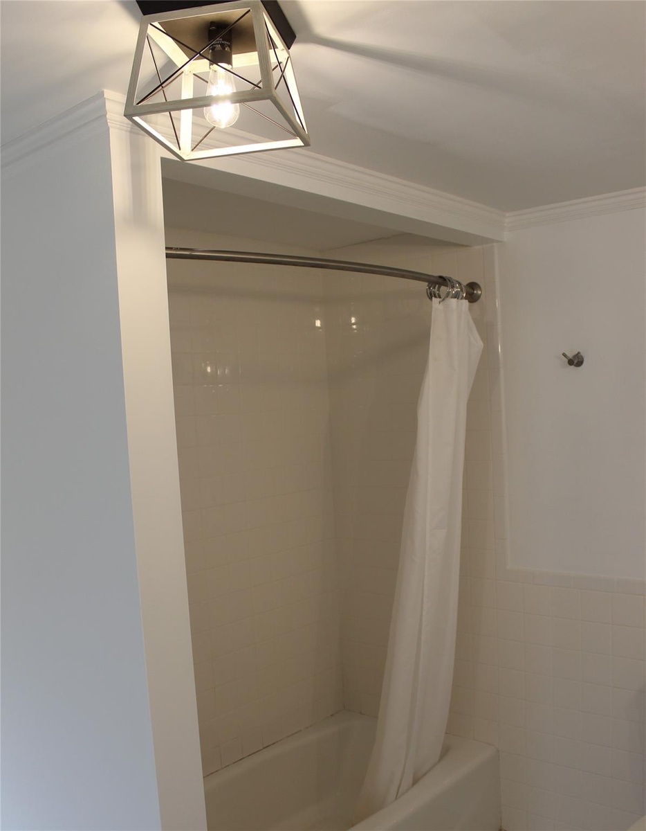 - Bathroom featuring crown molding, shower / bath combo, and tile walls