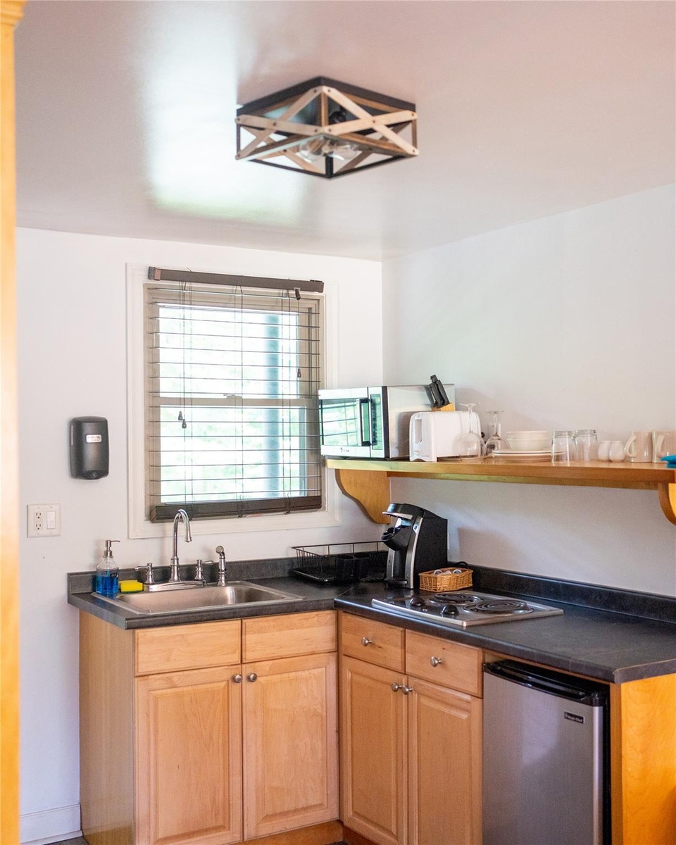 - Kitchen featuring dark countertops and appliances with stainless steel finishes