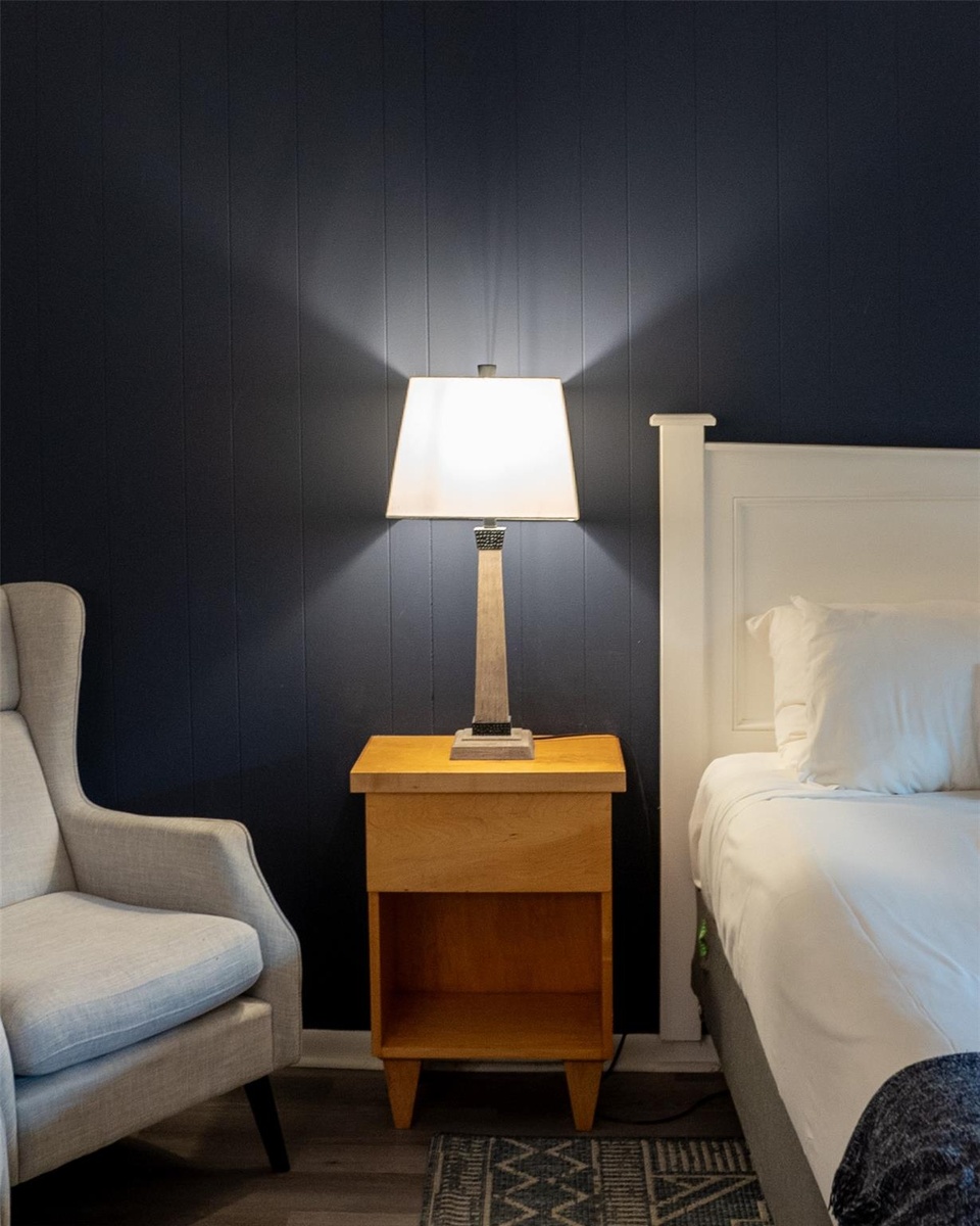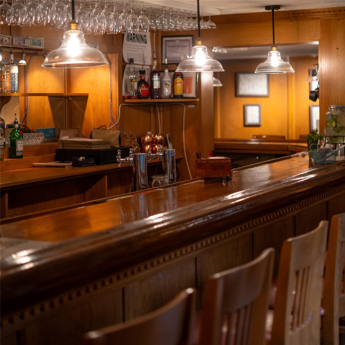 - Indoor dry bar with wooden walls and decorative light fixtures
