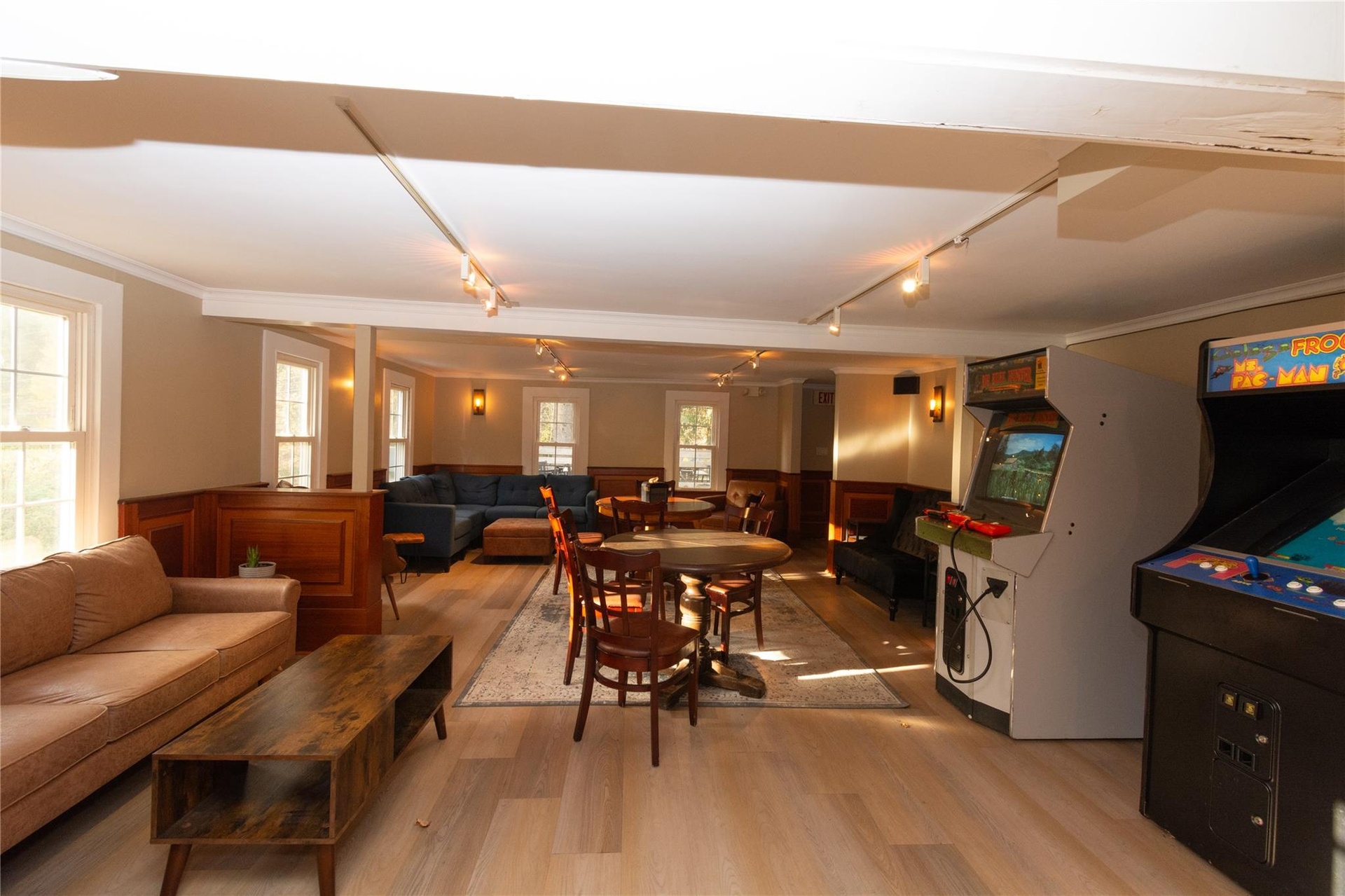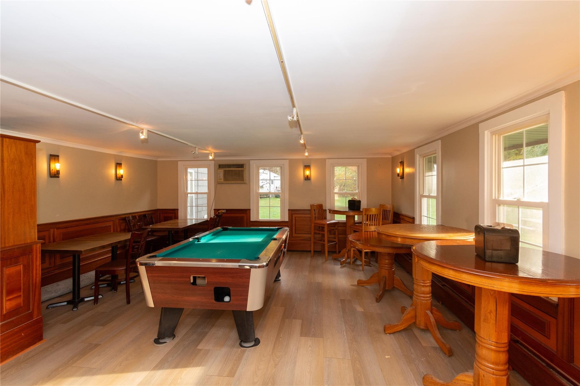- Recreation room featuring healthy amount of natural light, light wood-type flooring, billiards table, crown molding, and wainscoting