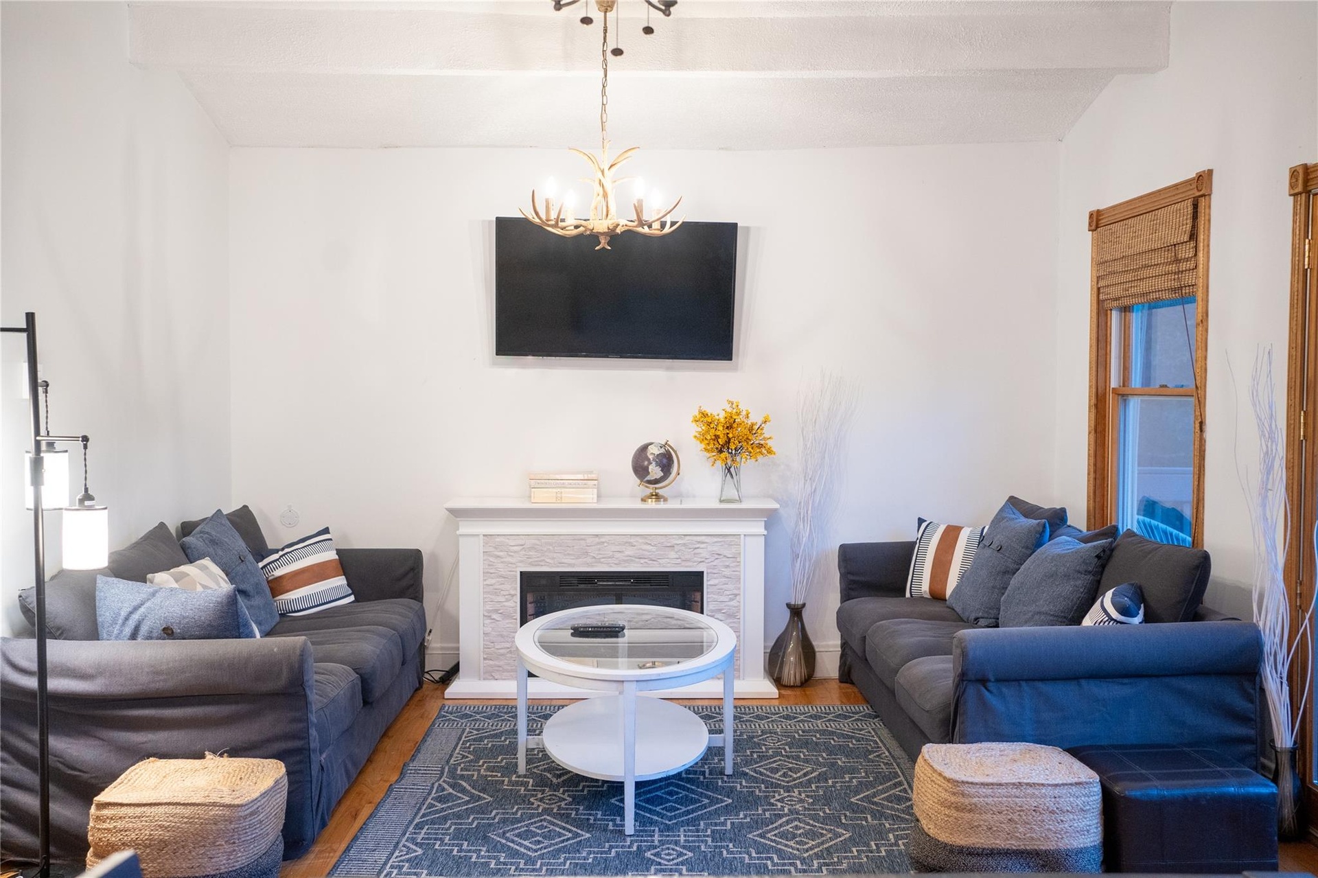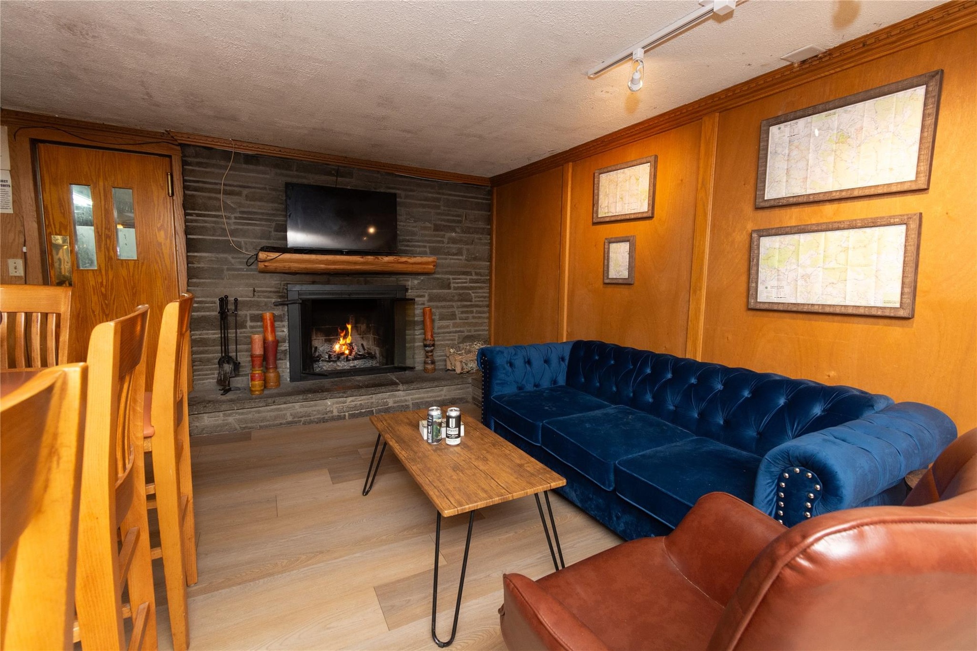 - Living area with wood walls, wood finished floors, a stone fireplace, rail lighting, and a textured ceiling