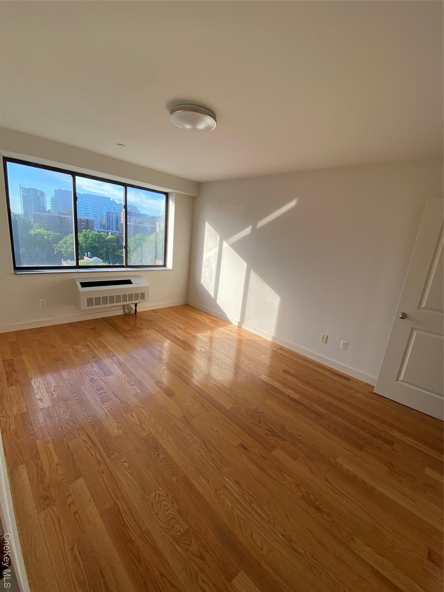 - Unfurnished room with wood finished floors and a wall mounted AC