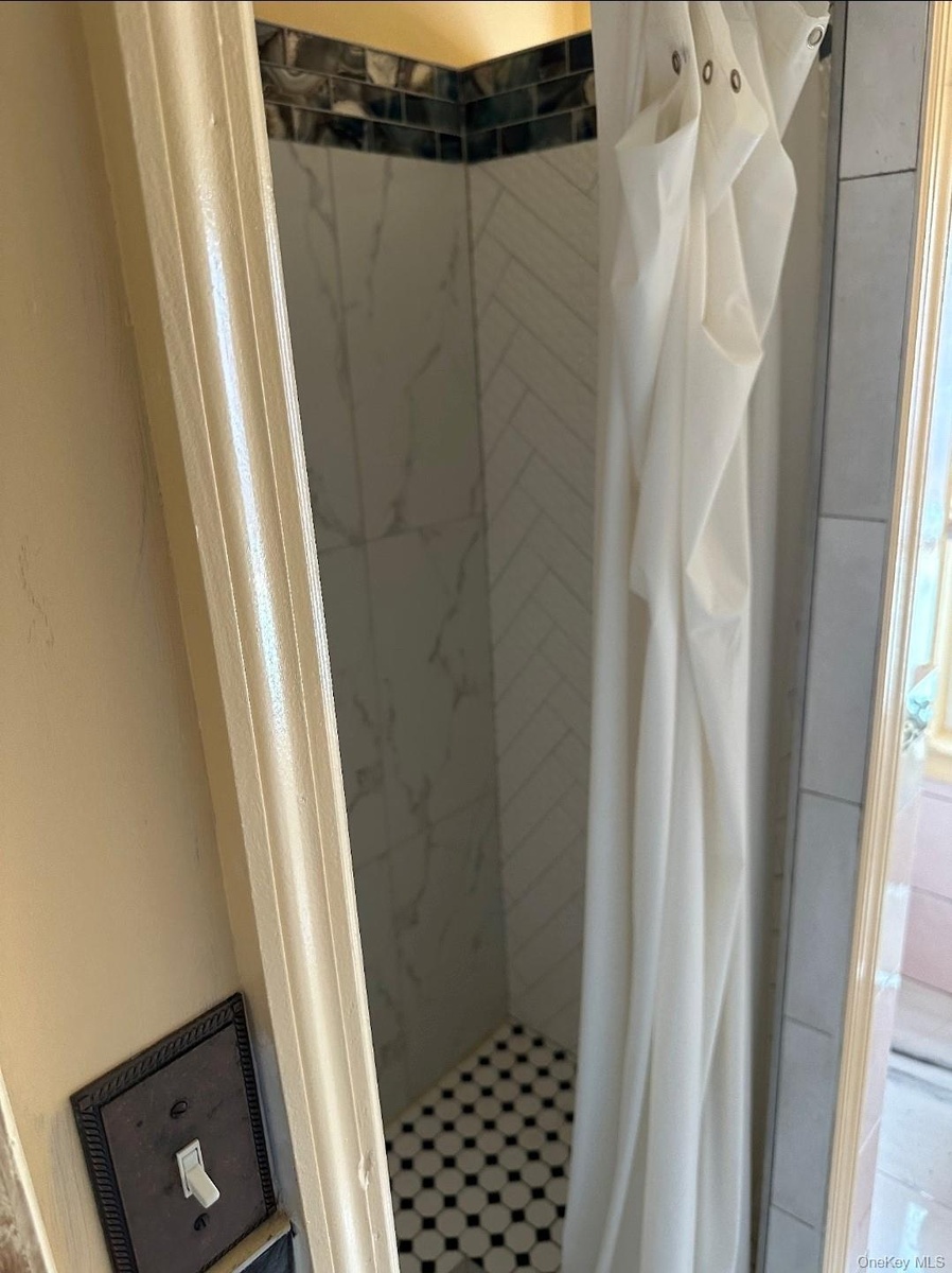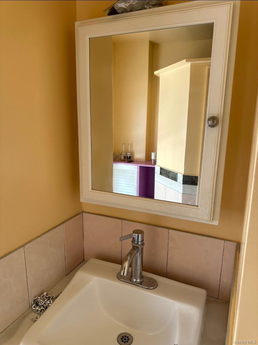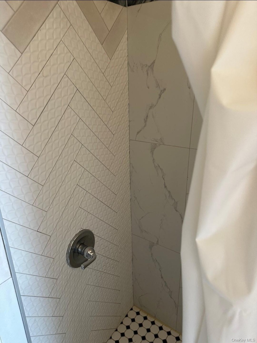 - Bathroom featuring tiled shower, vanity, and tile walls