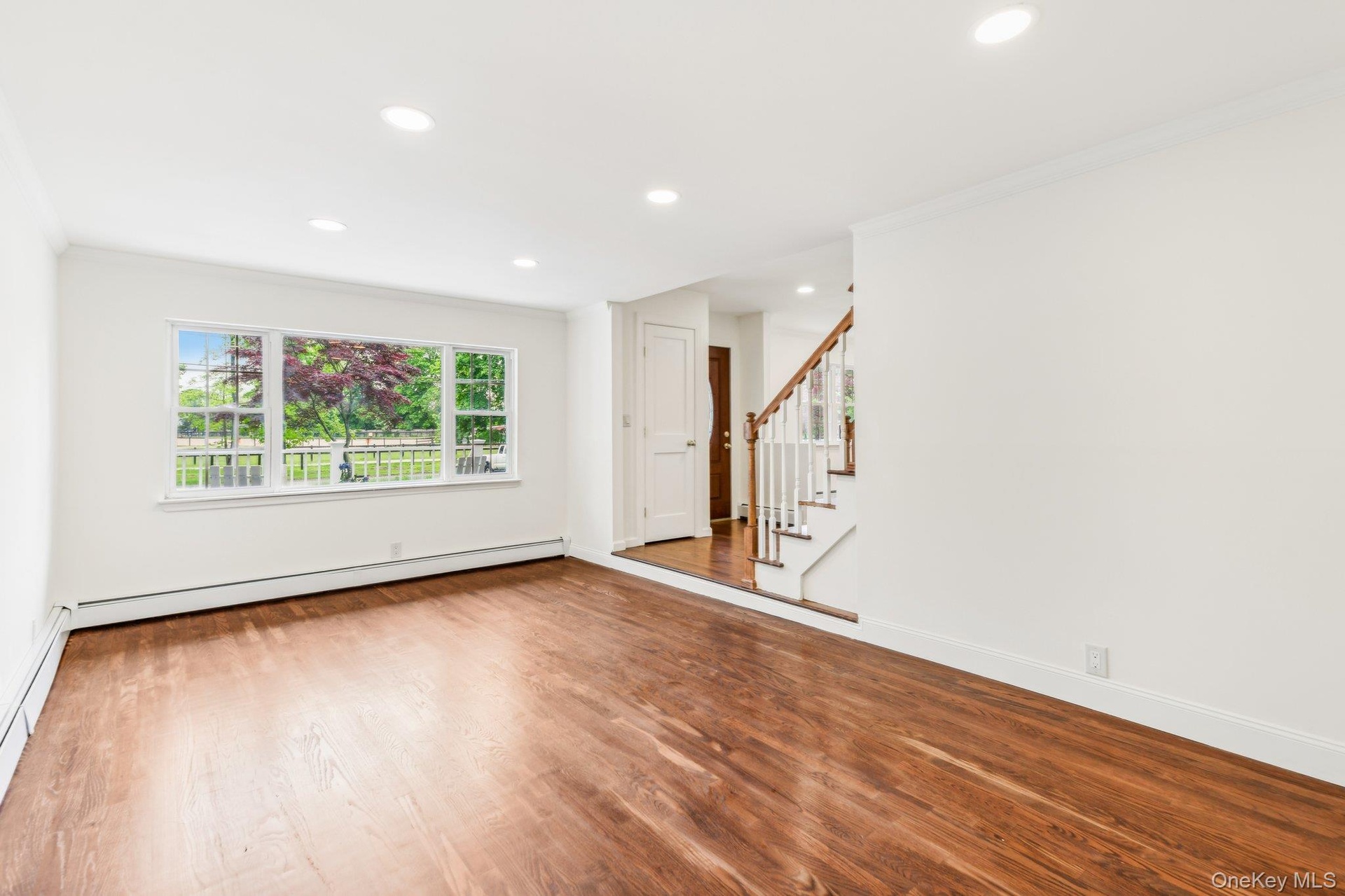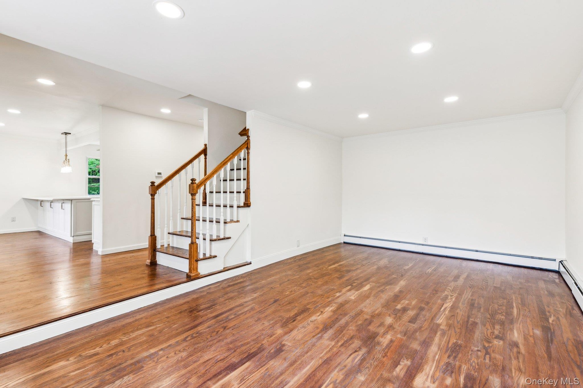 - Spare room featuring a baseboard heating unit, crown molding, recessed lighting, stairs, and wood finished floors