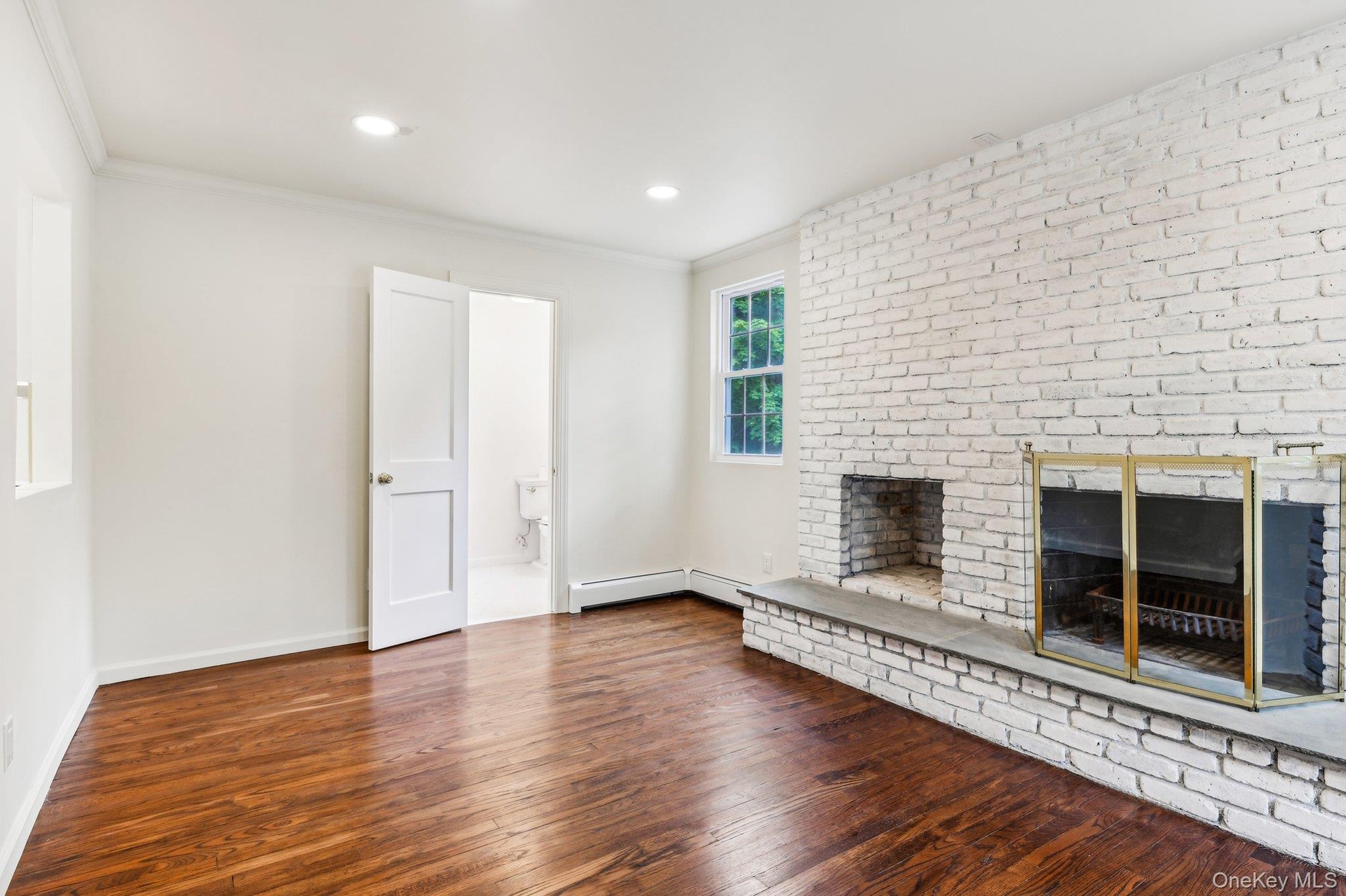 - Unfurnished living room with a brick fireplace, wood finished floors, crown molding, a baseboard heating unit, and baseboards