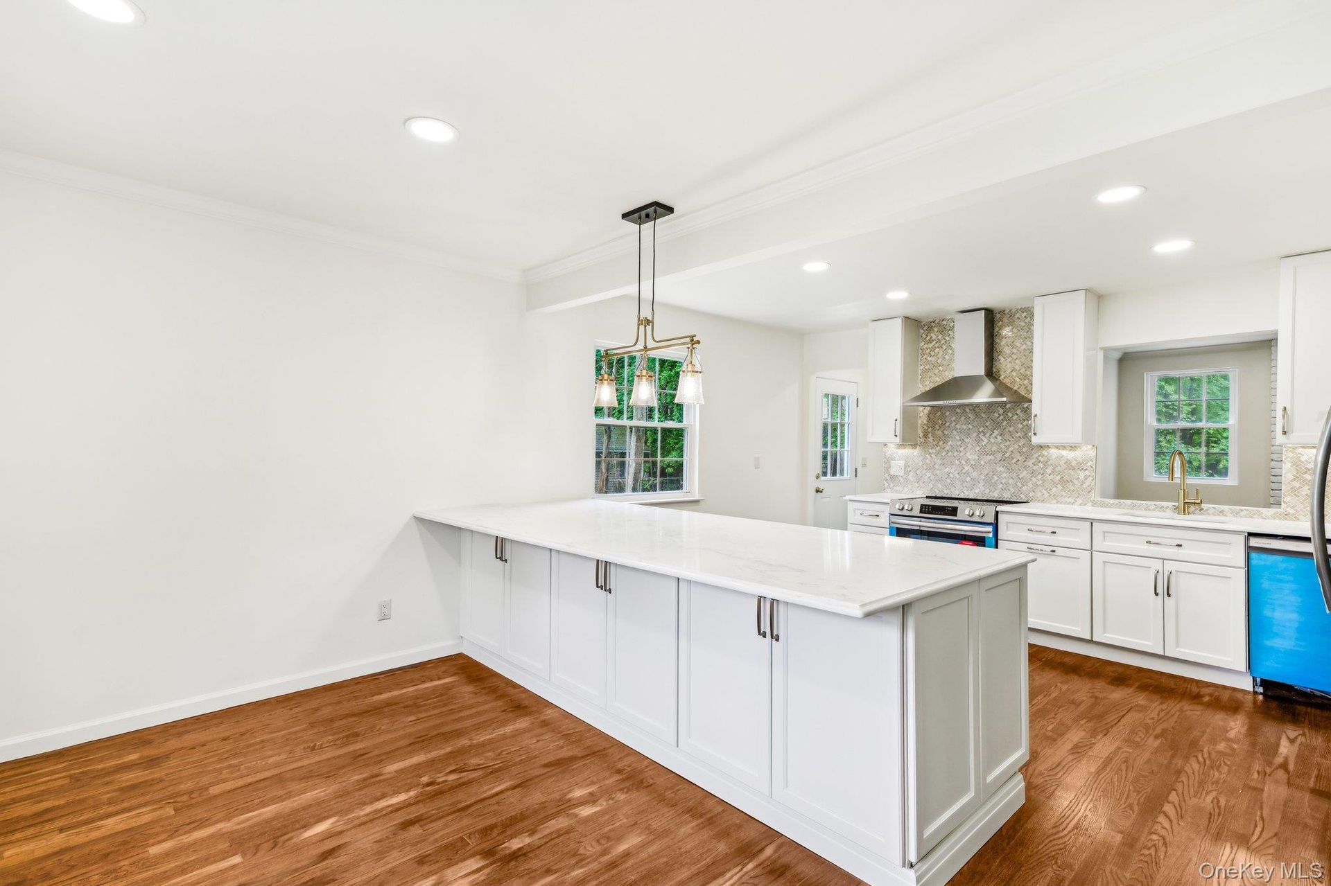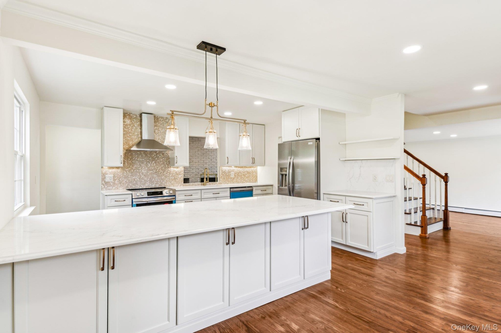 - Kitchen with stainless steel appliances, wall chimney range hood, open shelves, decorative backsplash, and recessed lighting