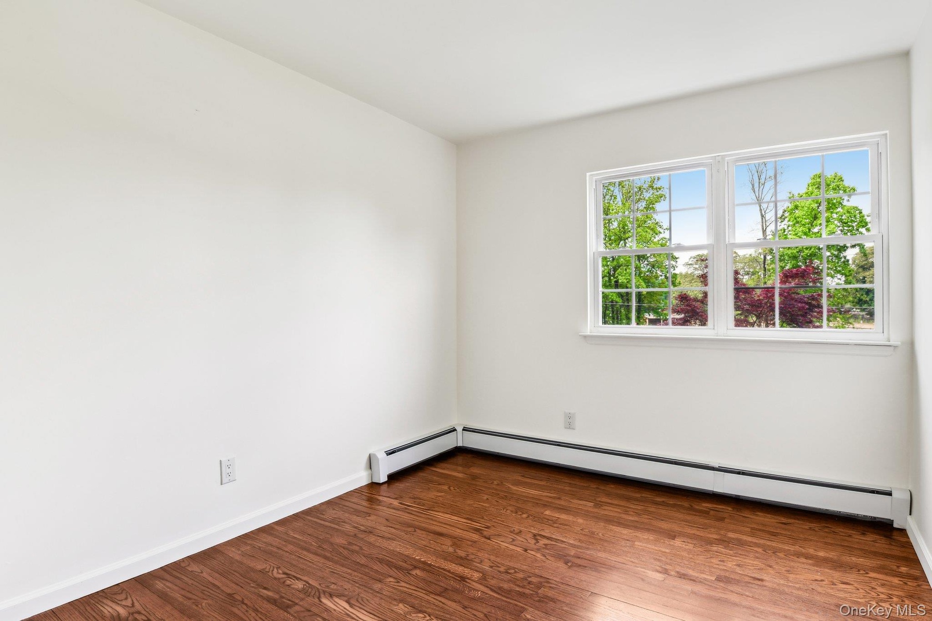 - Empty room featuring a baseboard radiator, wood finished floors, and baseboards