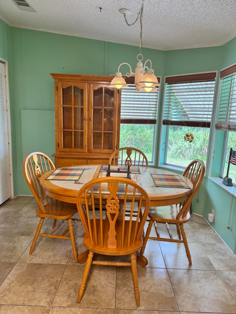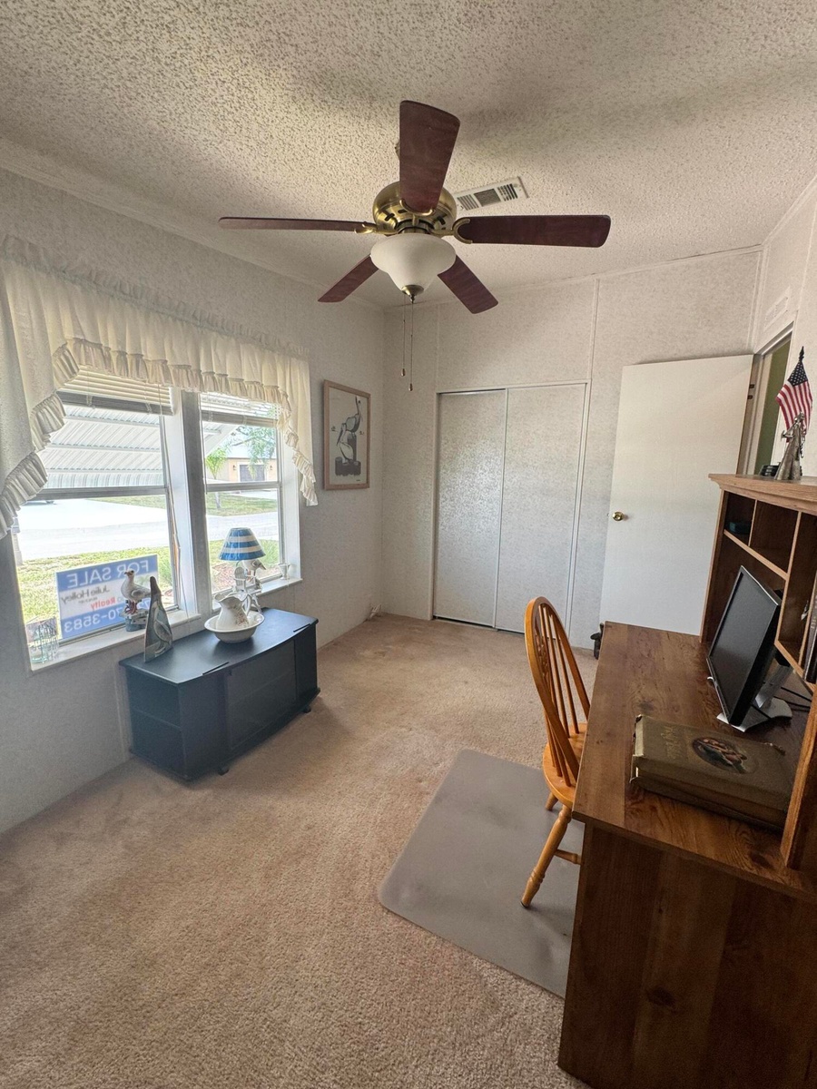 Lovely 3 bedroom 2 bath home in the desirable 55+Spanish Lakes Country Club Village community. House sits on quiet cal da sac and backs up to private wooded area. Split floor plan. Large great room and kitchen. Laundry inside home. Screened lanai off back of home as well as a shed. New metal roof 2025, New car port 2025. Water heater 2023. New shutters. Home is being sold furnished. Lawn care, trash removal and golf included in lot rent.18 hole golf course,2 pools, tennis, pickleball, bocce ball, shuffle board and much more. Must See!