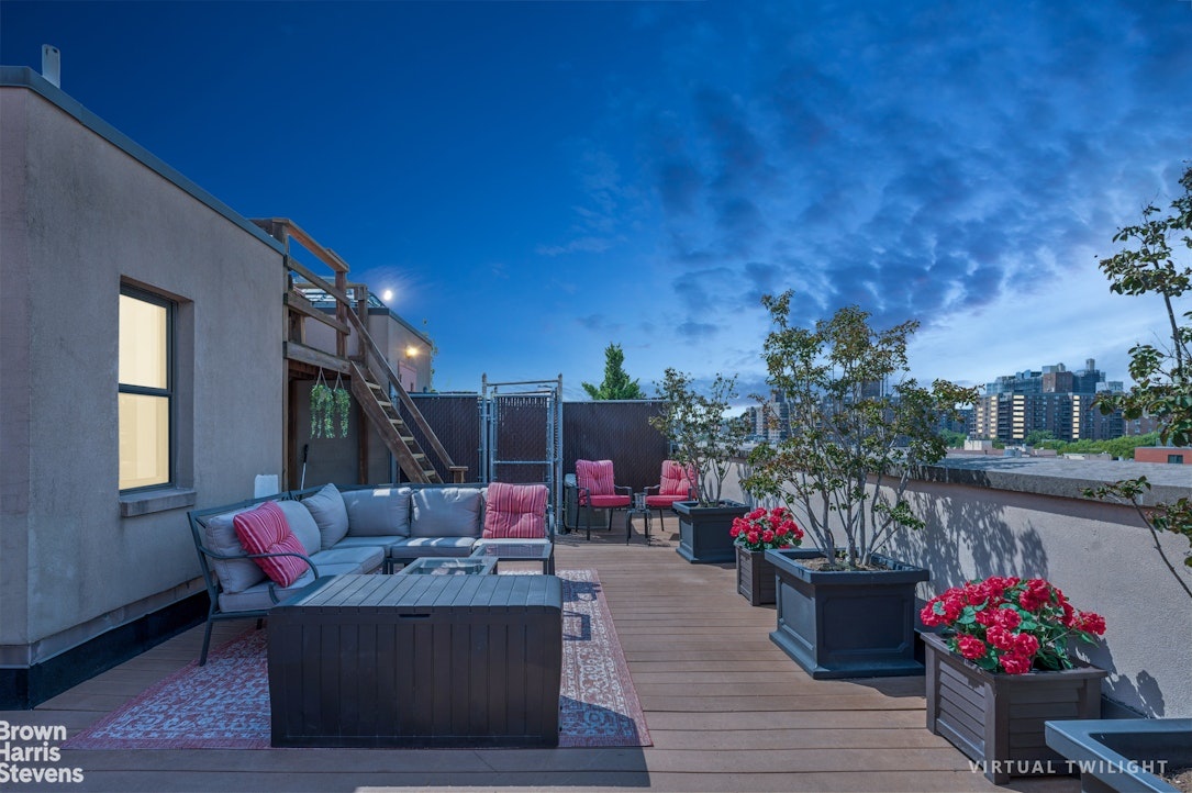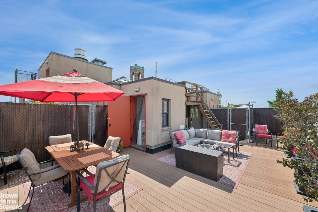 The jewel in the crown of this home is its two level private roof deck. It feels like its own apartment - it's big enough for a large dining table, chez lounges, and multiple sofas. This deck has its own working water line, so it's easy to water your plants and flowers. There are also power outlets. This outdoor space is great for throwing parties, hosting more intimate gatherings, and even for moments of being alone on your own private roof deck.