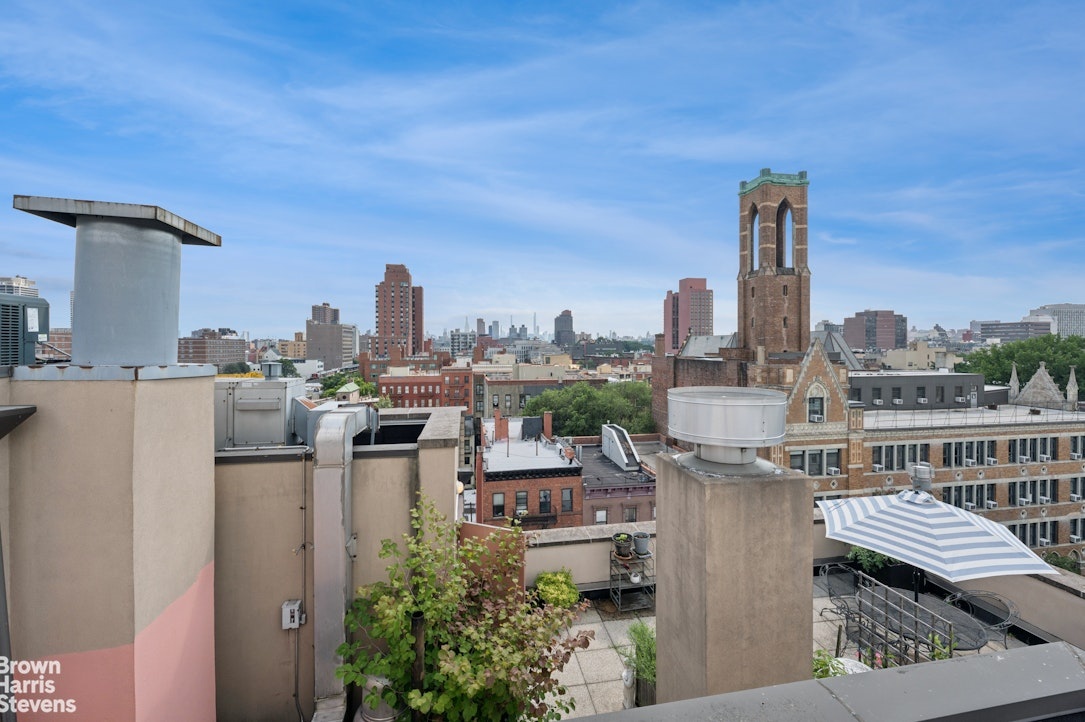 Two bedroom penthouse with a private two story roof deck in a Central Harlem condo. Large windows and open views on the top floor of this building provide lots of great light. There are beautifully refinished wood floors throughout. Since the two bedrooms are on opposite sides of the apartment, they providing a feeling of privacy in this home. The primary bedroom is sizable, has an ensuite tiled bathroom, and has two separate closets on opposite ends of the bedroom. The kitchen has polished granite countertops, lots of cabinet space, and brand new stainless steel appliances, including a Bosch dishwasher and microwave. The range provides convection and air frying, has two separate temperature range settings, and the microwave also has a convection and air fryer! There are brand new through the wall air conditioners, so no need to install and remove A/C units with the change of season. There are five closets, providing lots of storage space.