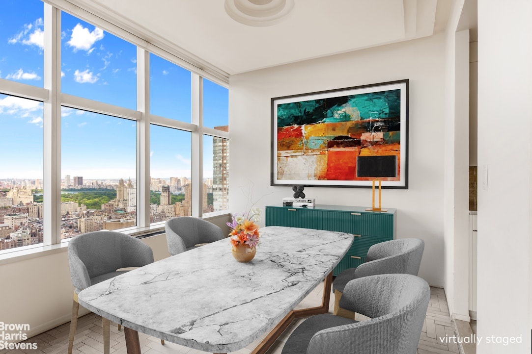 Spanning 1,562 square feet, this two-bedroom, two-and-a-half-bathroom home boasts unobstructed West and North exposures, showcasing stunning panoramic views of Central Park, the Reservoir, Hudson River, George Washington Bridge, and Upper Manhattan's skyline.
