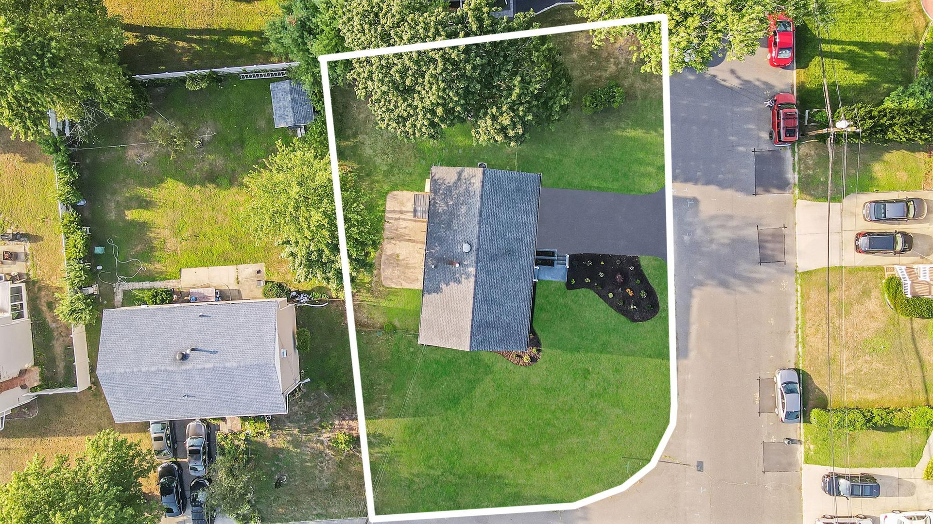 - Aerial view of property and surrounding area featuring property boundaries highlighted