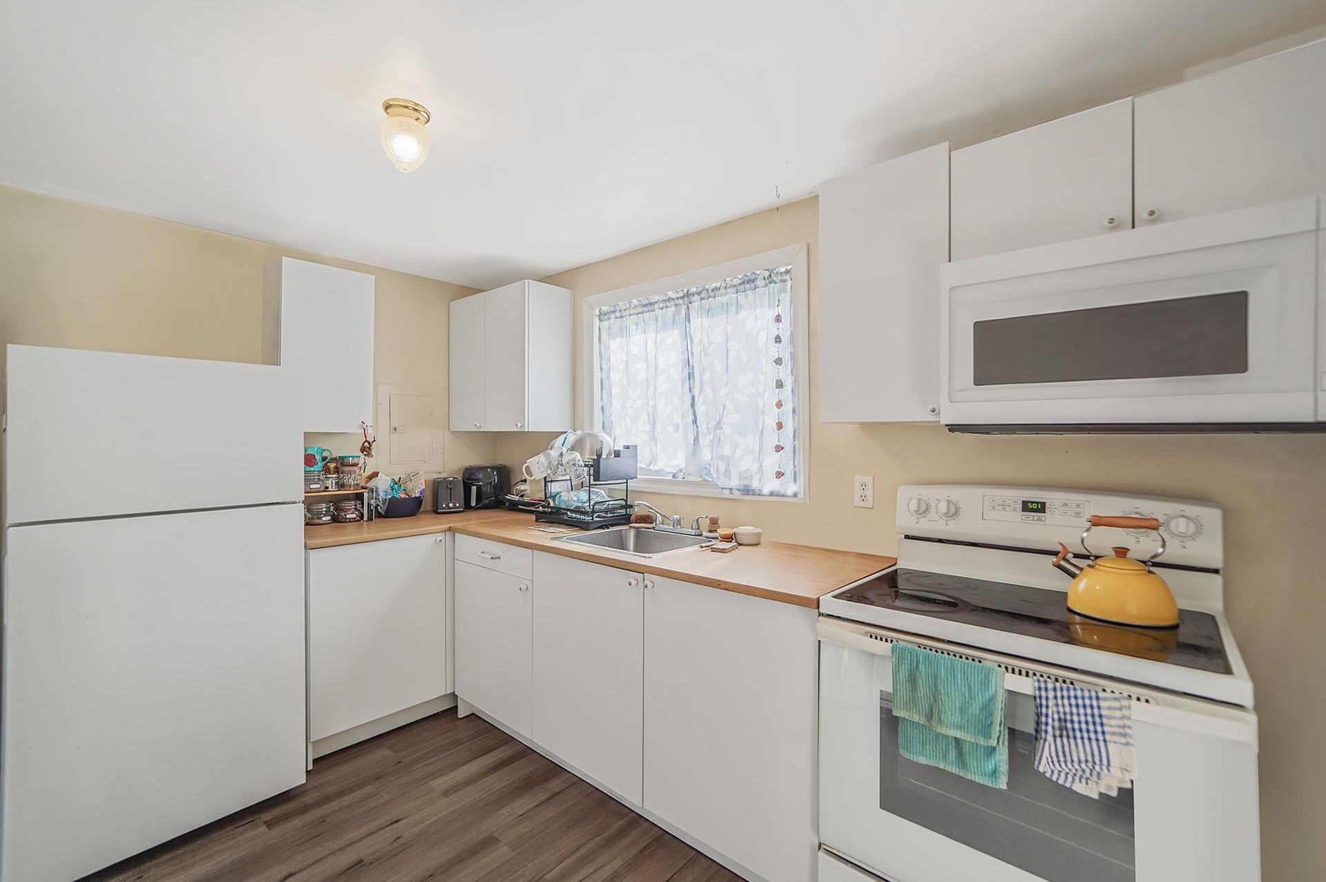 - Kitchen featuring white appliances, wood finished floors, and white cabinetry