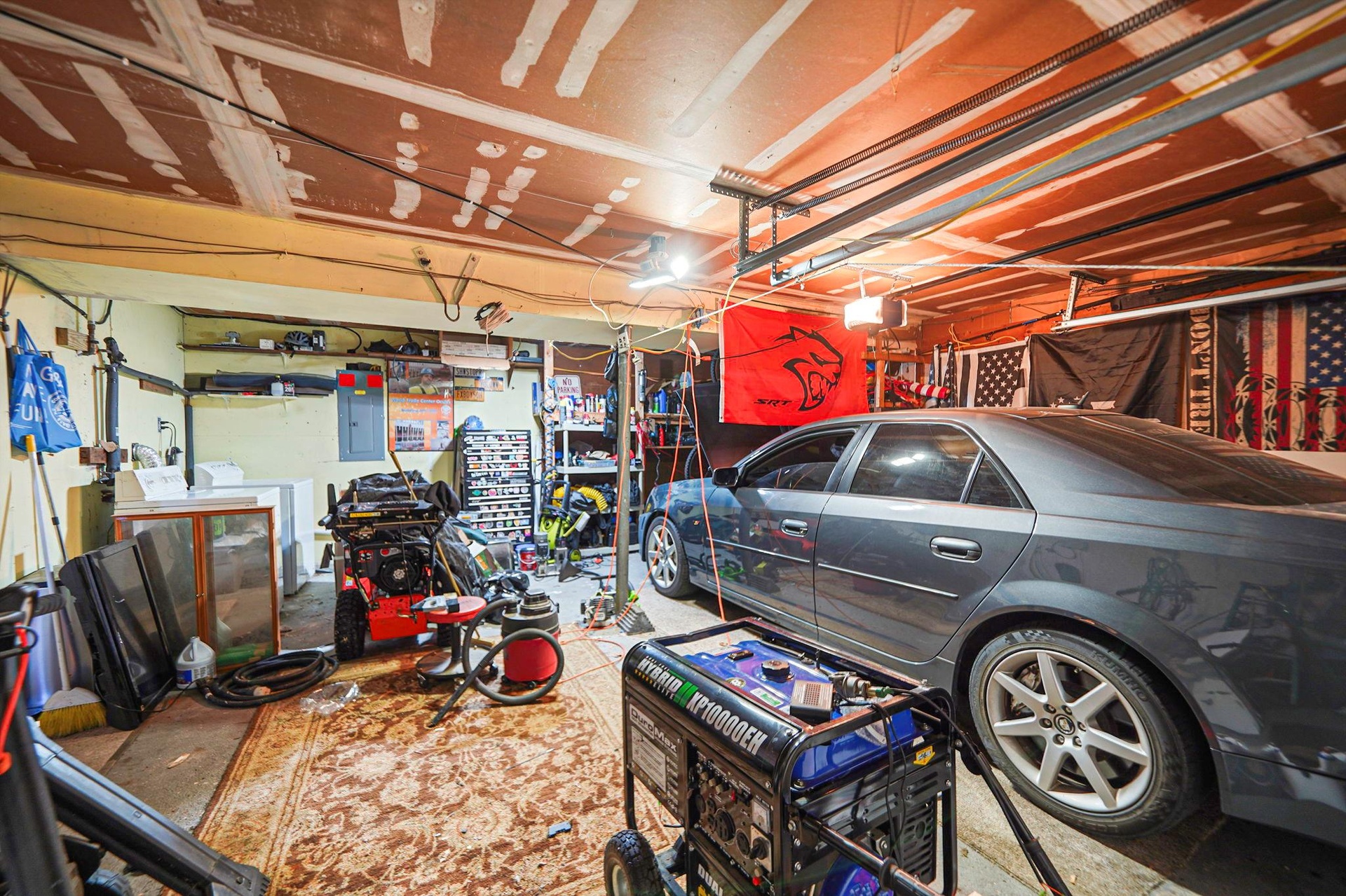 - Garage featuring a workshop area, washer / clothes dryer, electric panel, and a garage door opener