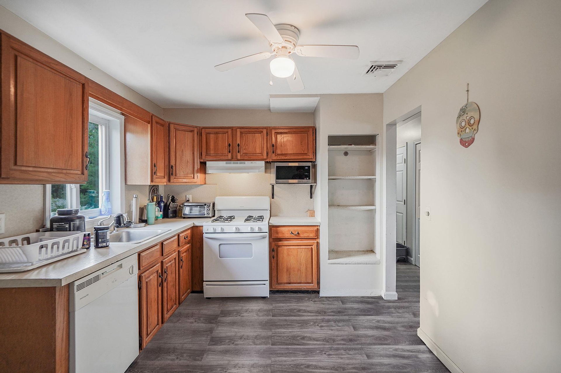 - Kitchen featuring white appliances, dark wood-type flooring, light countertops, brown cabinetry, and ceiling fan