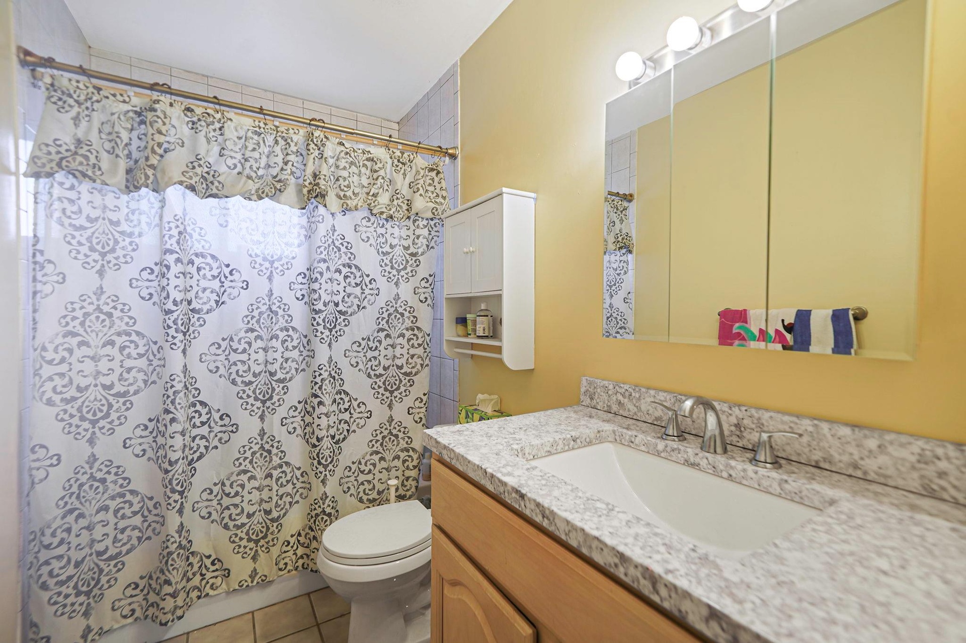 - Bathroom with vanity, curtained shower, and tile patterned floors