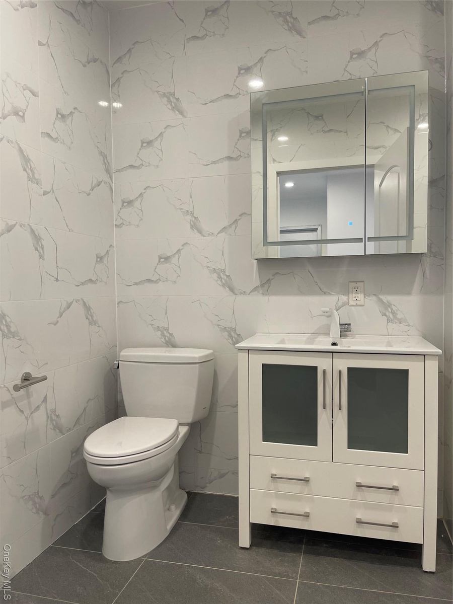 - Bathroom featuring tile walls and vanity