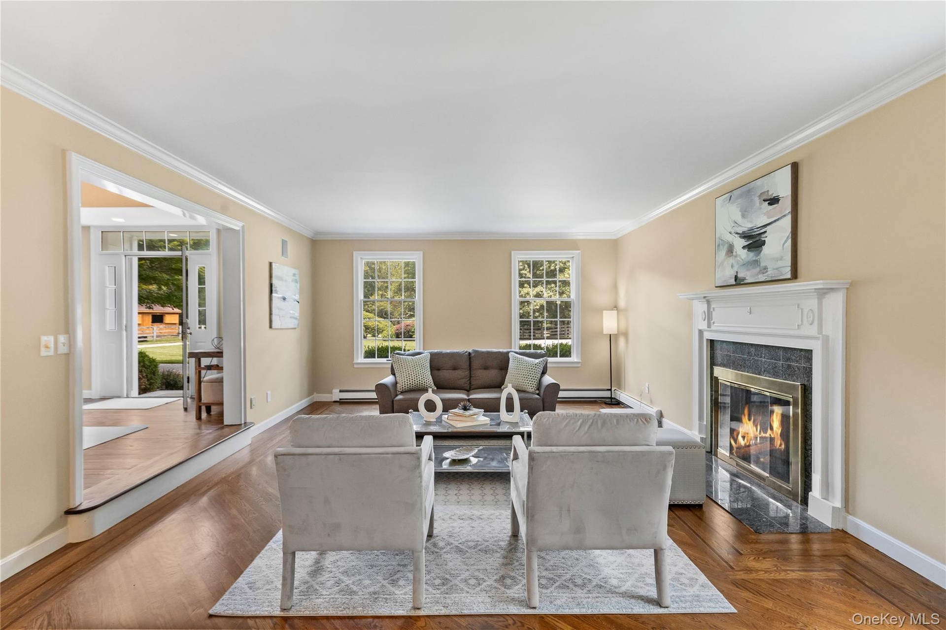 - Living area featuring ornamental molding, a fireplace, wood finished floors, and a baseboard heating unit