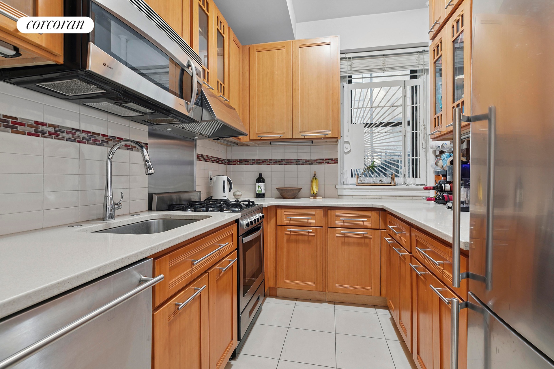 SPACIOUS, corner one bedroom co-op apartment waiting for you to move right in. North and west facing, this large home has oversize windows, nine-foot ceilings, refinished and stained hardwood floors, three big closets, including a walk-in closet in the bedroom. The renovated windowed kitchen has abundant cabinet space, stainless steel appliances, which includes gas range, dishwasher, microwave, recirculating vent hood, and refrigerator. There is a separate galley foyer, new hardware throughout, new doors, French doors, nicely finished walls, custom lighting and window treatments.