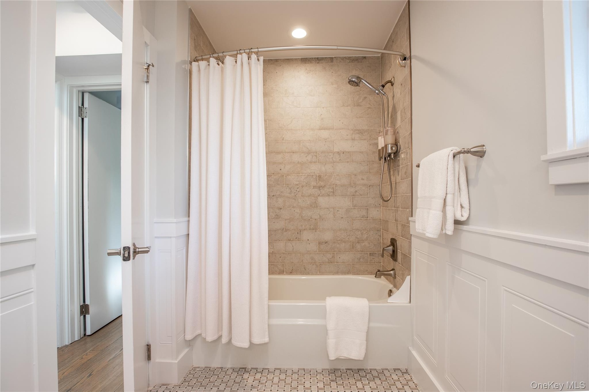 - Bathroom featuring shower / tub combo with curtain, a wainscoted wall, a decorative wall, and wood finished floors