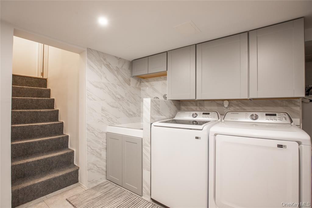 - Laundry room featuring cabinet space, washing machine and clothes dryer, tile walls, and tile patterned flooring