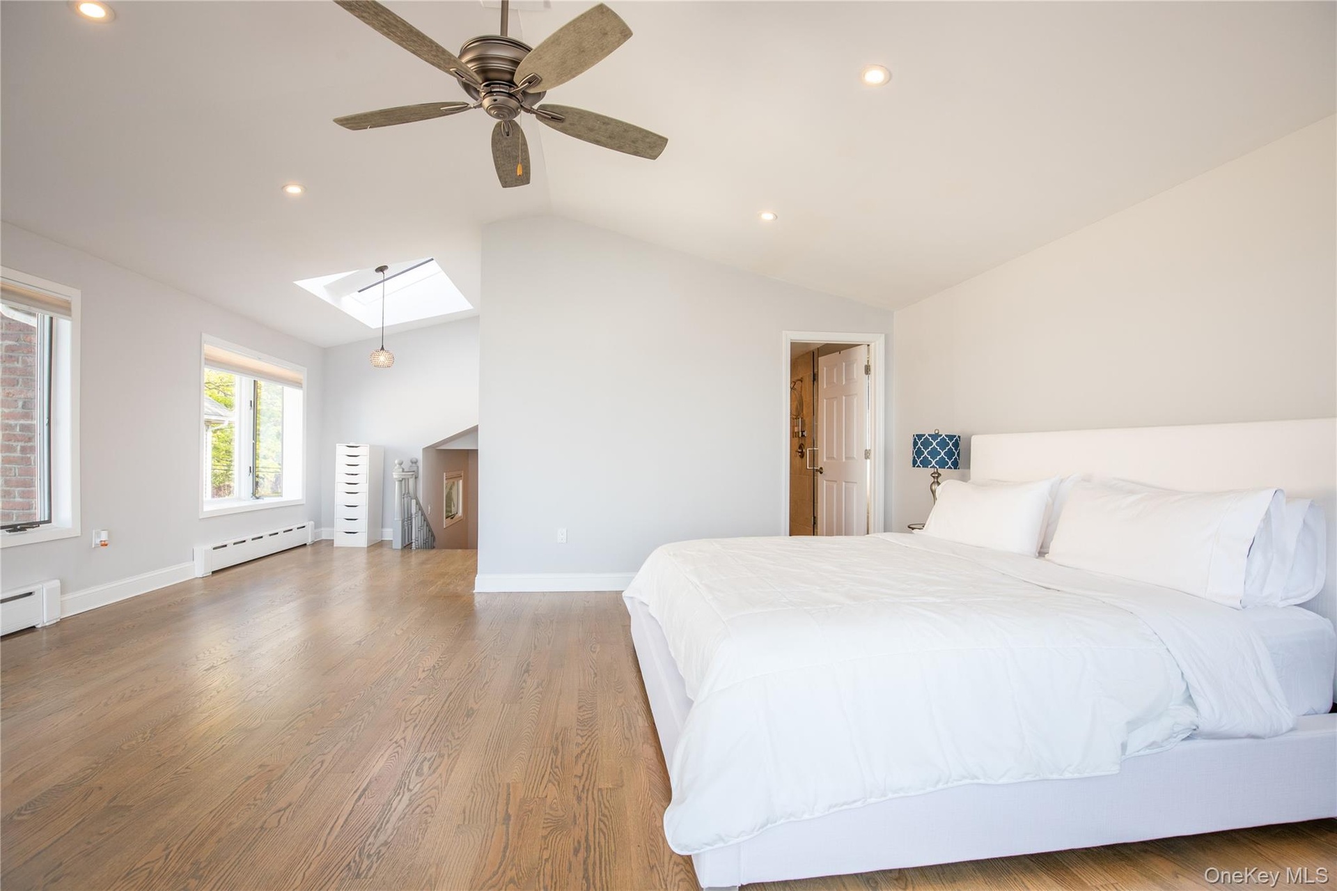 - Bedroom with a skylight, wood finished floors, recessed lighting, lofted ceiling, and a baseboard heating unit