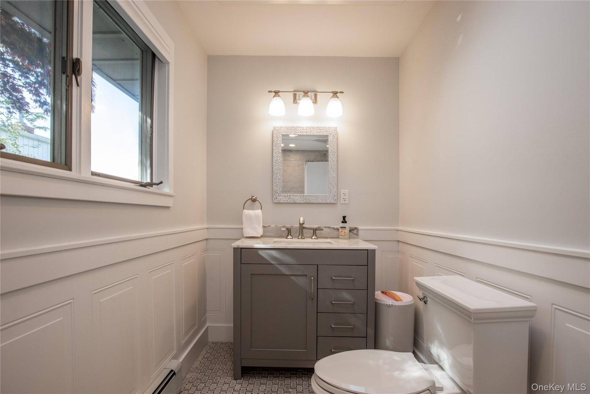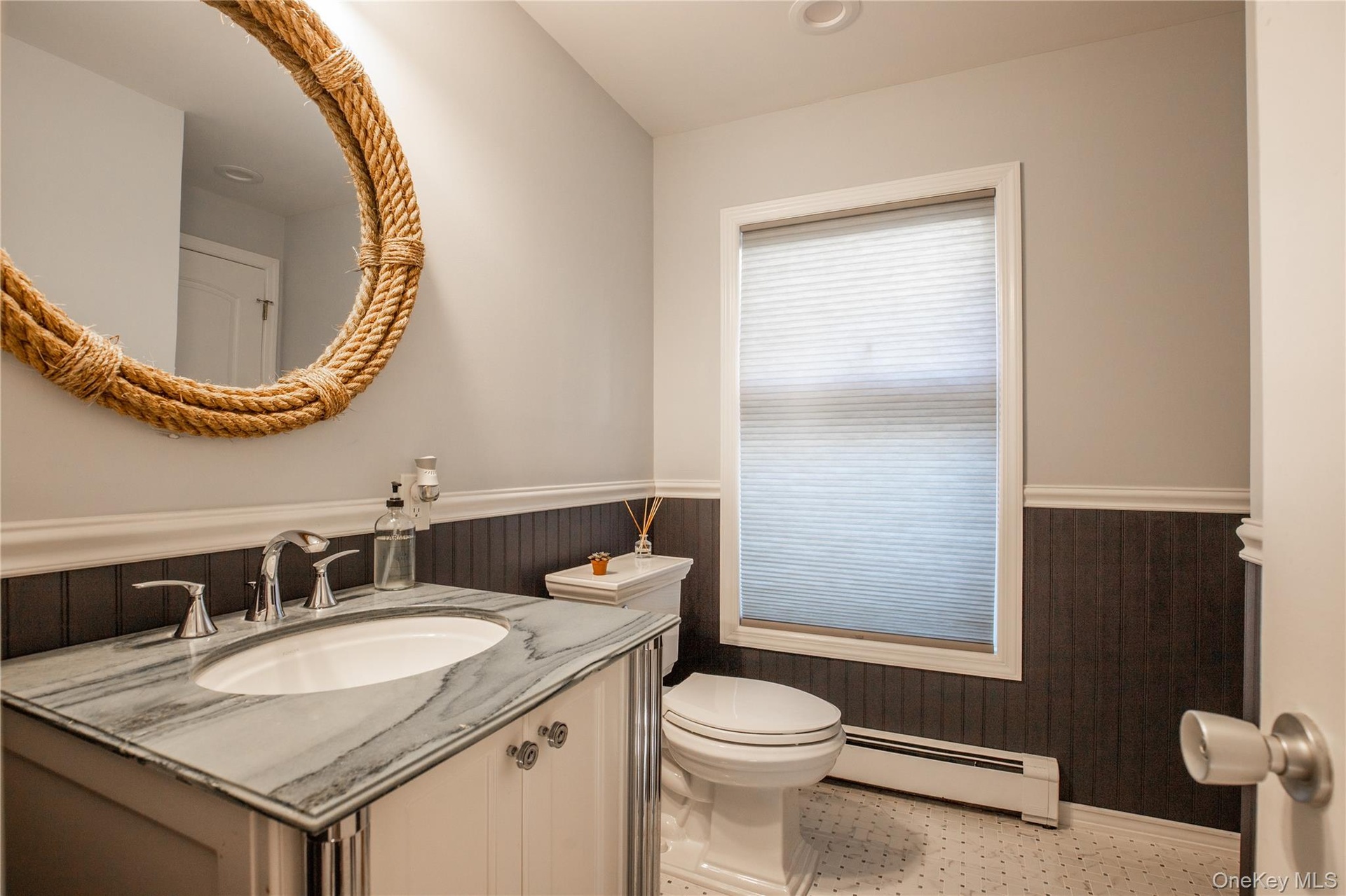 - Bathroom with vanity, a baseboard heating unit, wainscoting, a decorative wall, and tile patterned floors