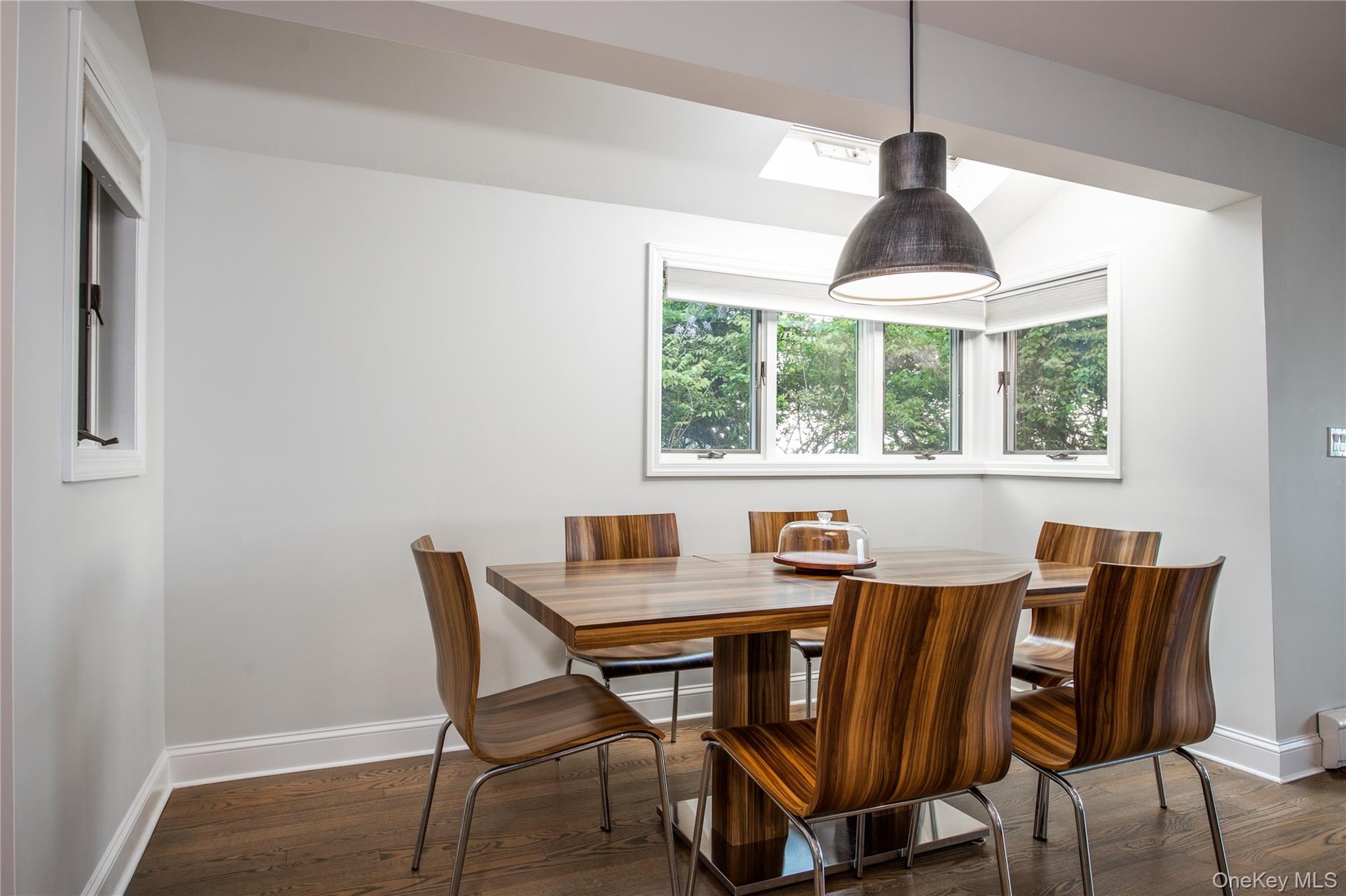 - Dining space with dark wood finished floors and baseboards