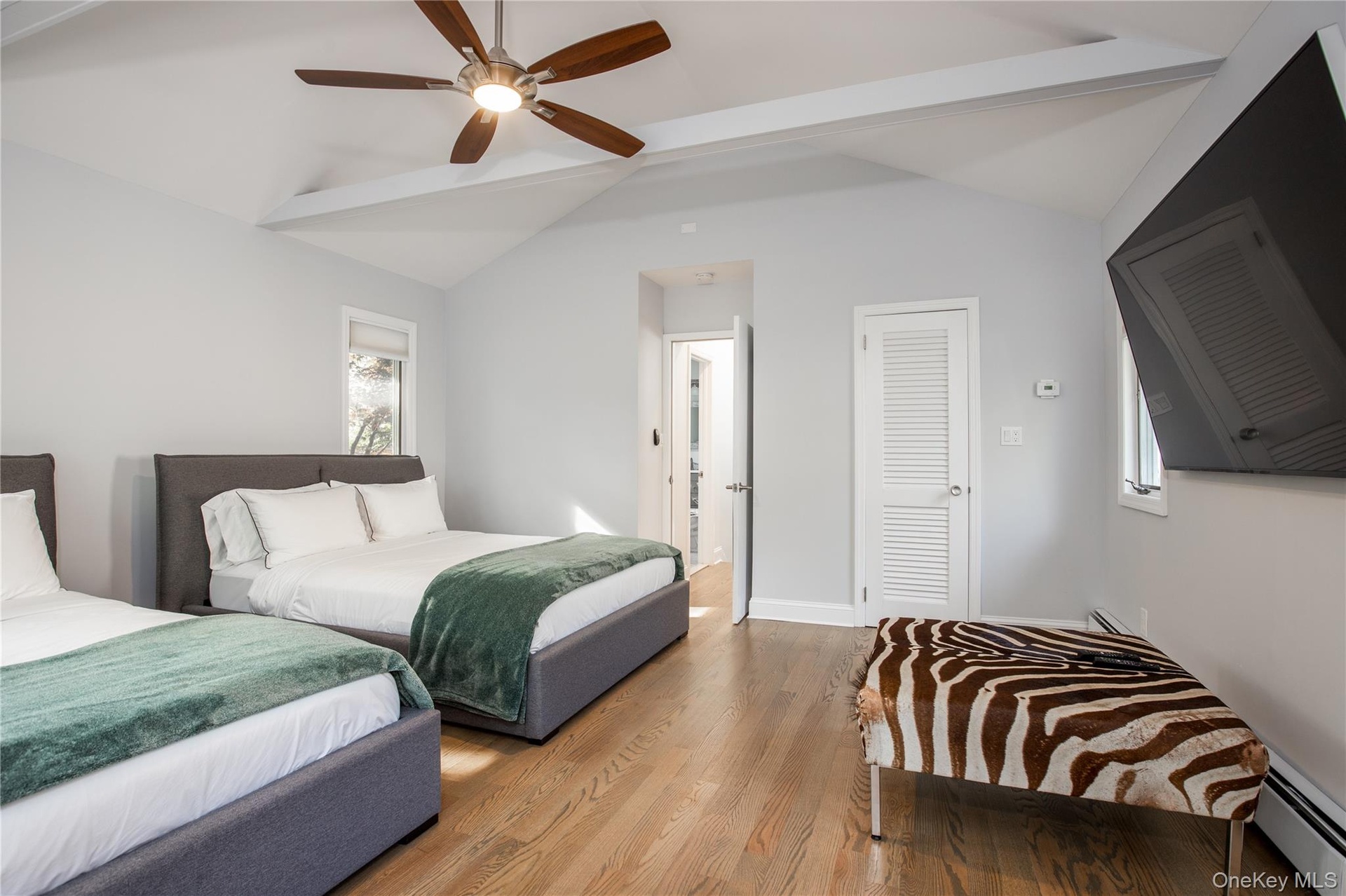 - Bedroom with light wood-style flooring, a baseboard radiator, and ceiling fan