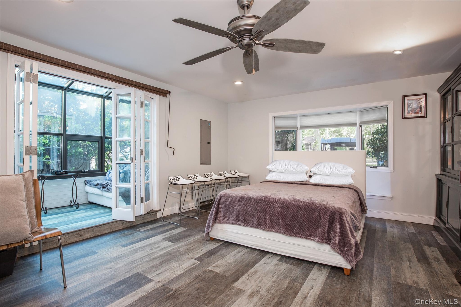 - Bedroom with dark wood-style floors, recessed lighting, electric panel, and ceiling fan
