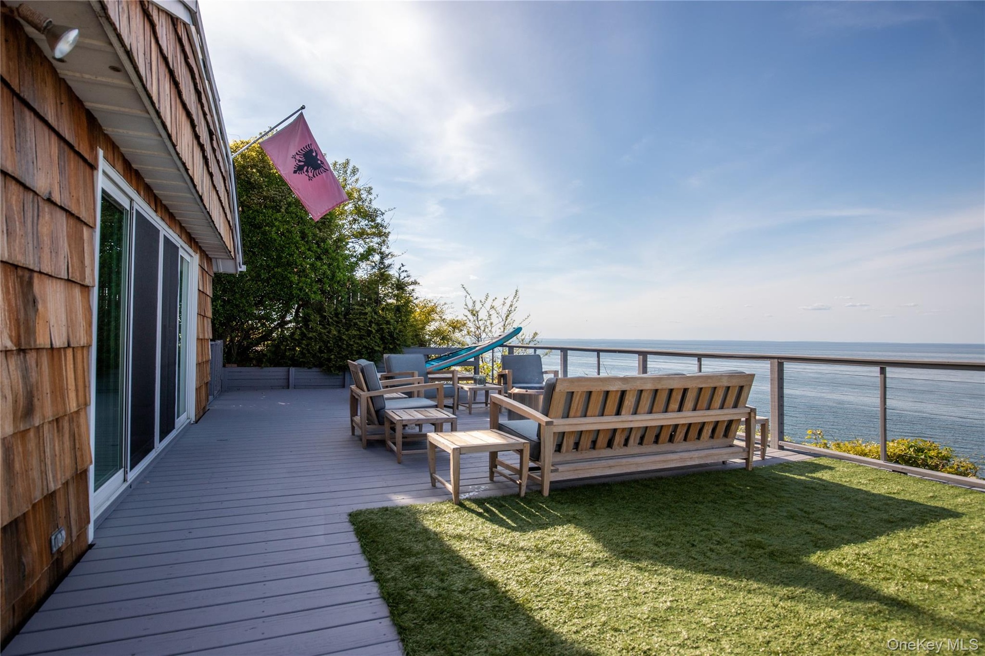 - Wooden terrace with a water view, a lawn, and an outdoor hangout area