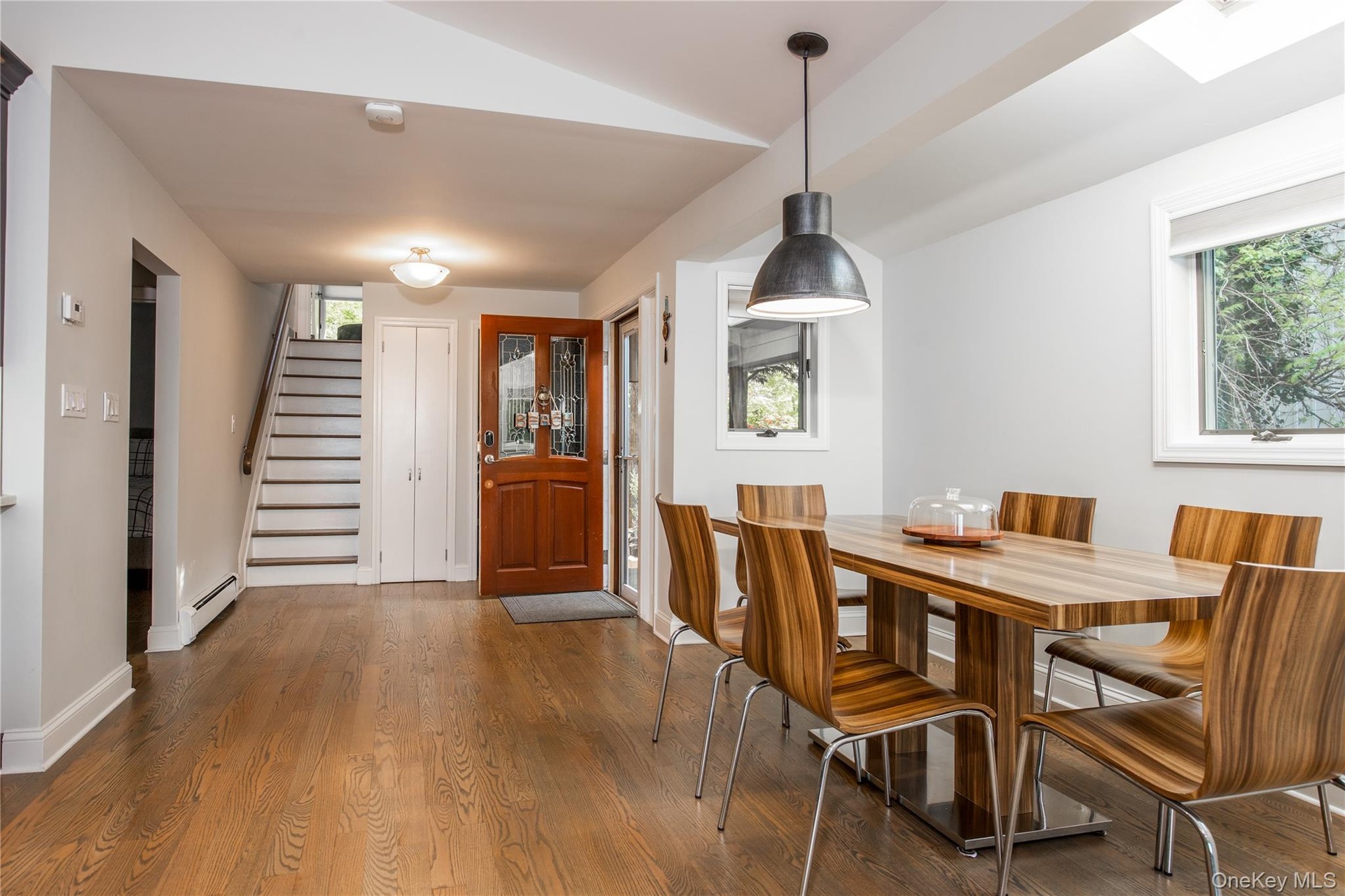 - Dining area with stairway, wood finished floors, vaulted ceiling, and baseboard heating