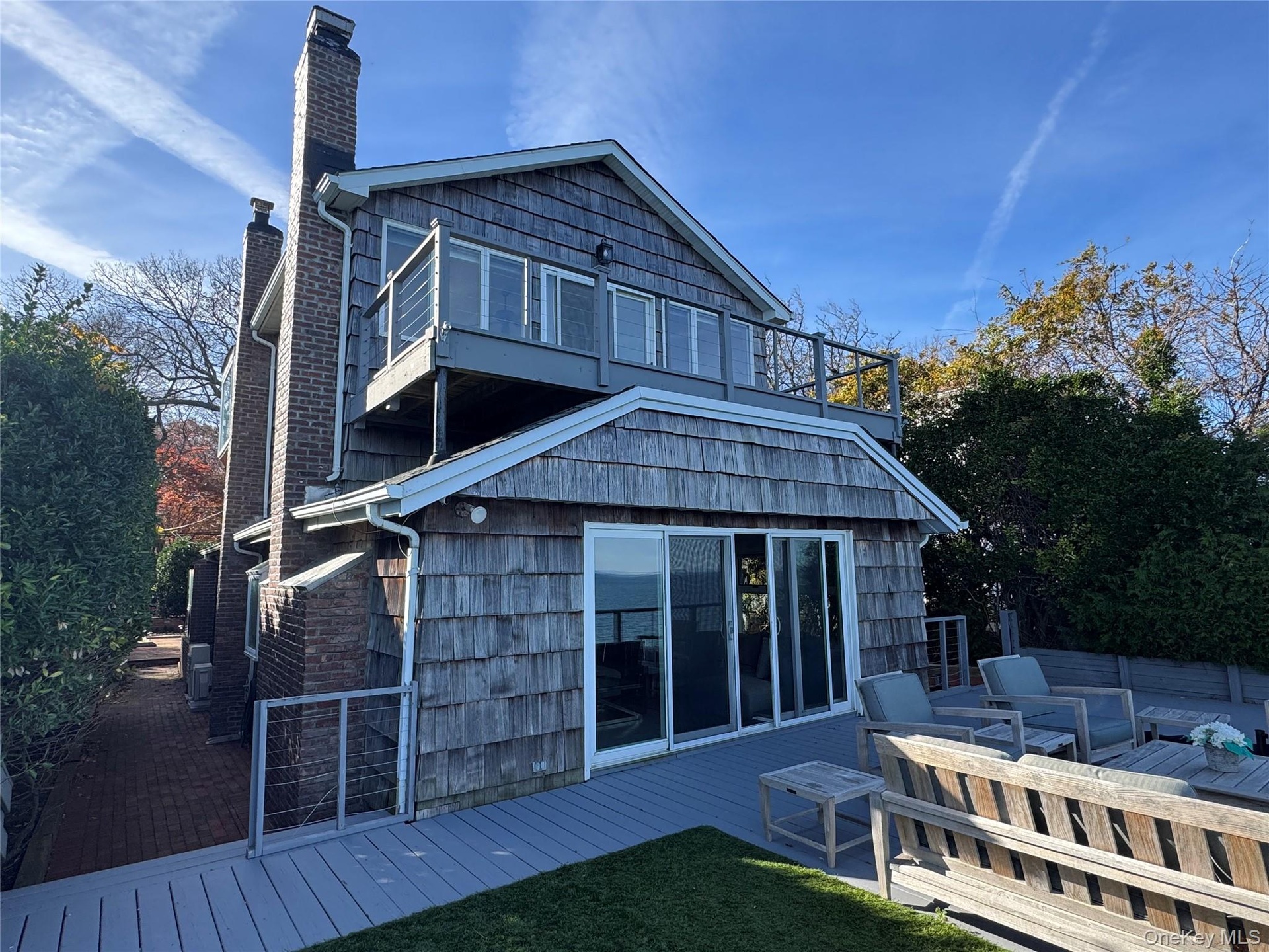 - Back of house with a deck, a chimney, and a balcony