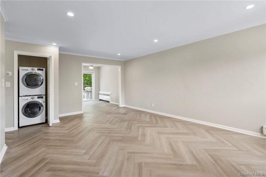 - View of living room with hall washer and dryer