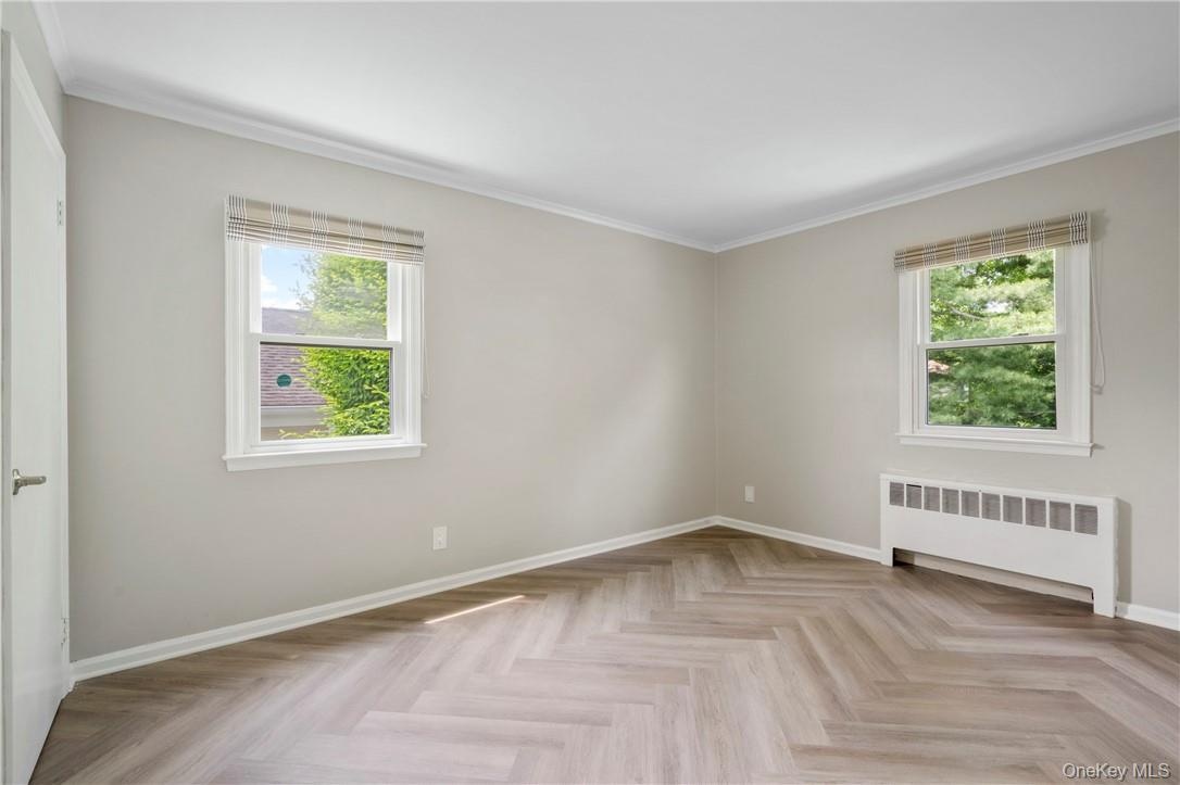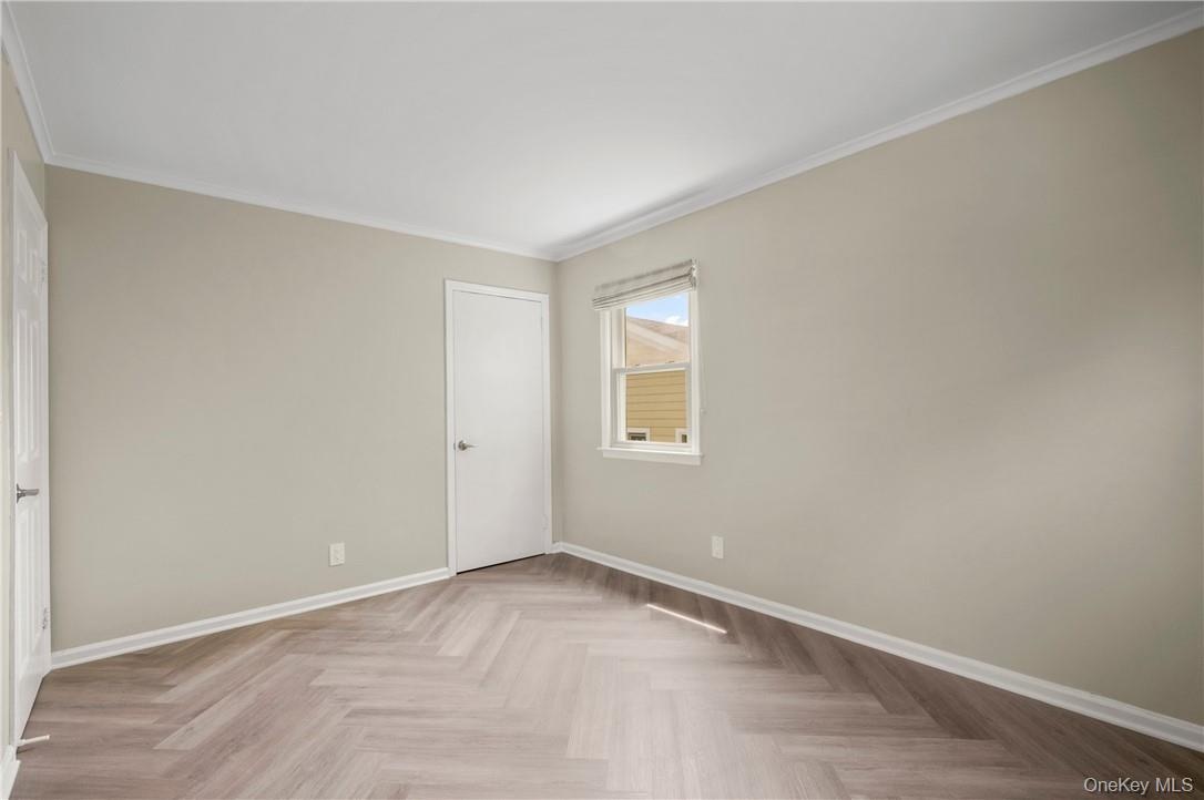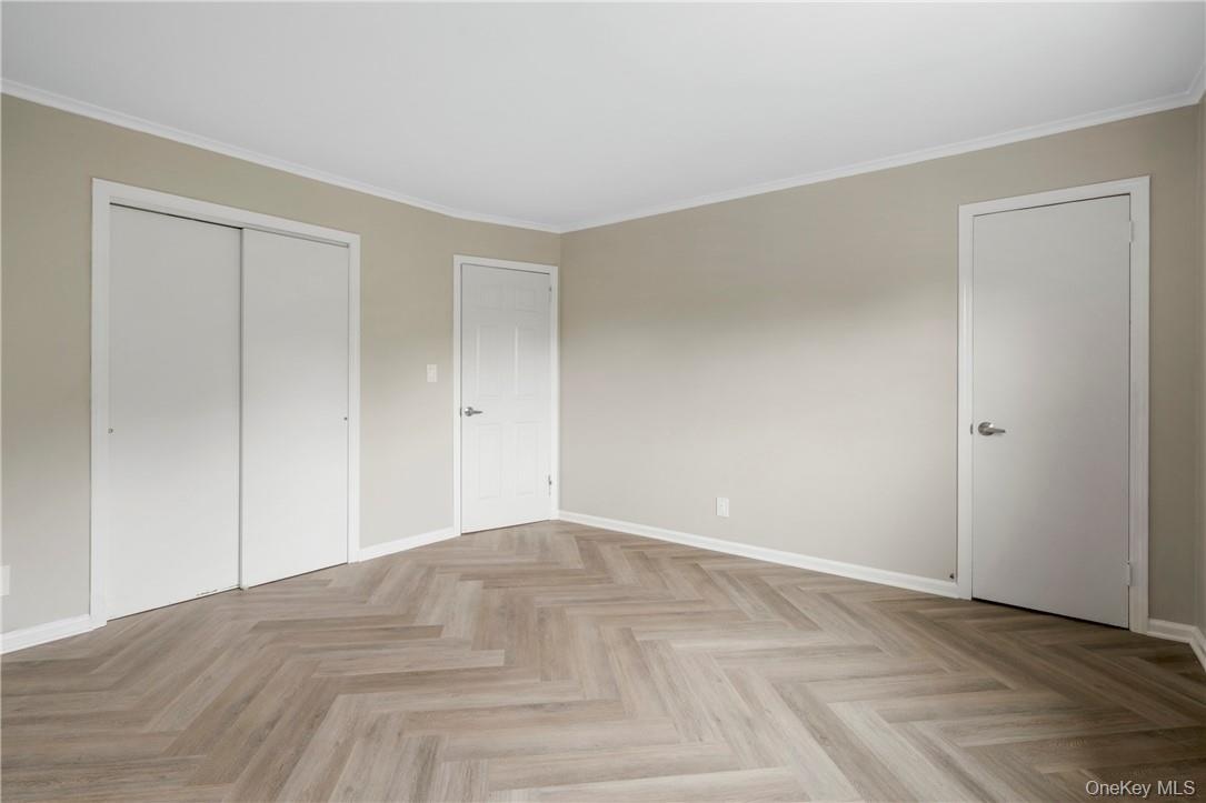- Unfurnished bedroom with crown molding and wood floors