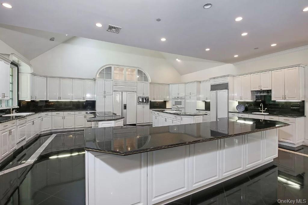 - Kitchen featuring backsplash, recessed lighting, dark stone countertops, white cabinetry, and high vaulted ceiling