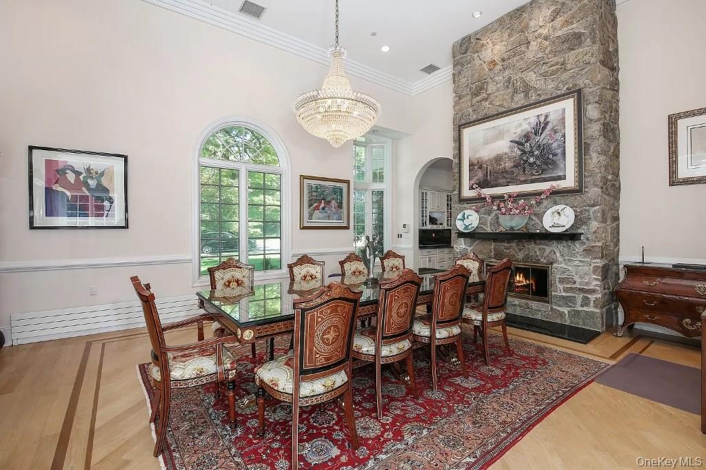 - Dining space with a fireplace, a chandelier, light wood-type flooring, ornamental molding, and arched walkways