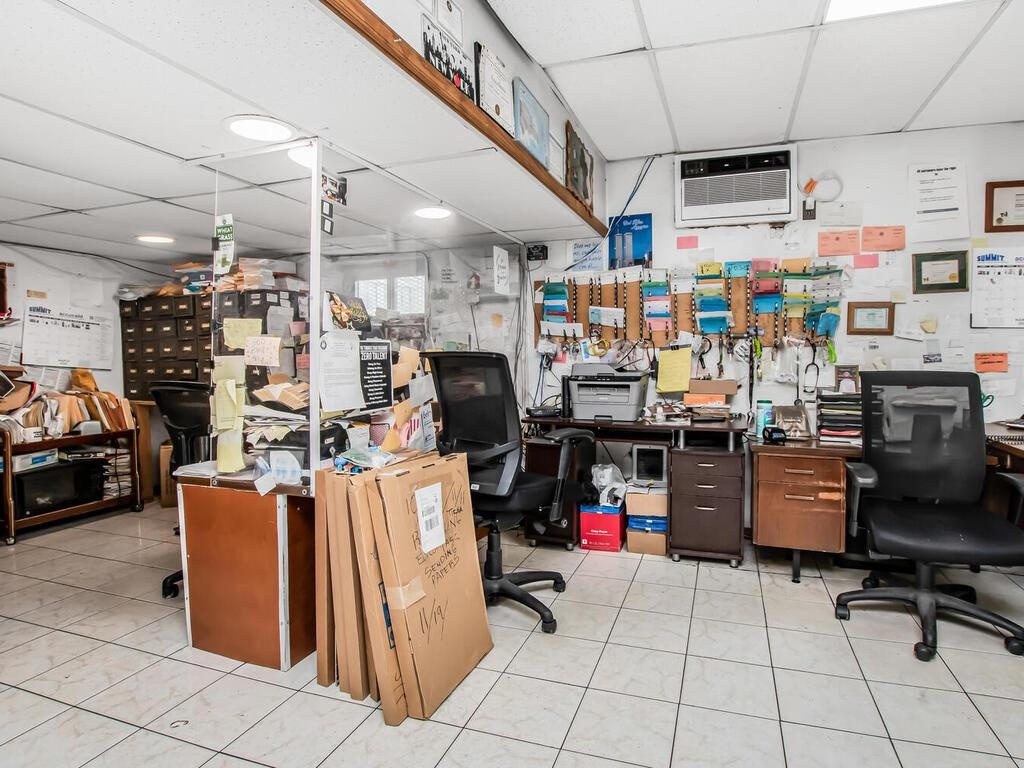 - Tiled office space featuring a drop ceiling and a wall unit AC