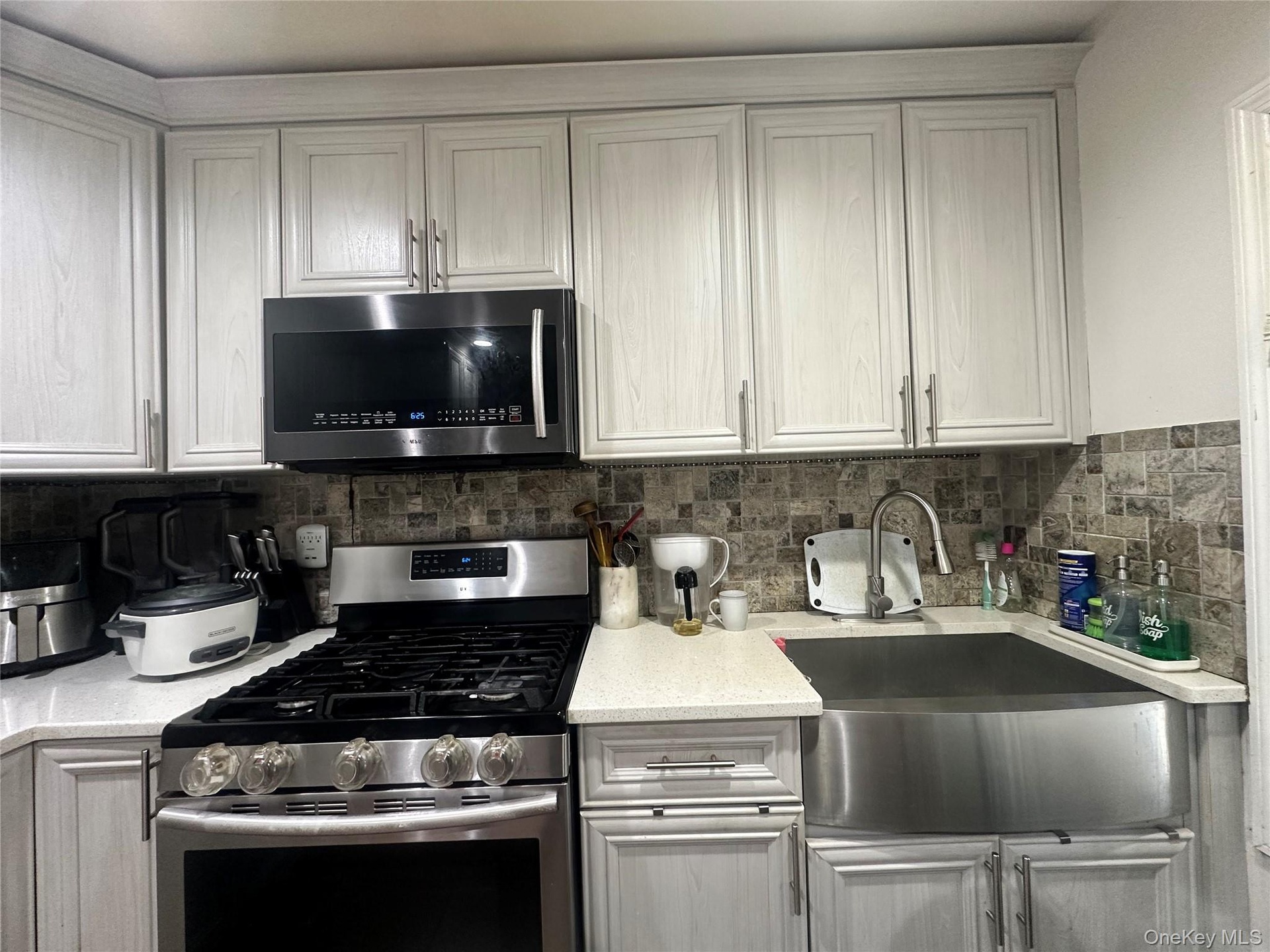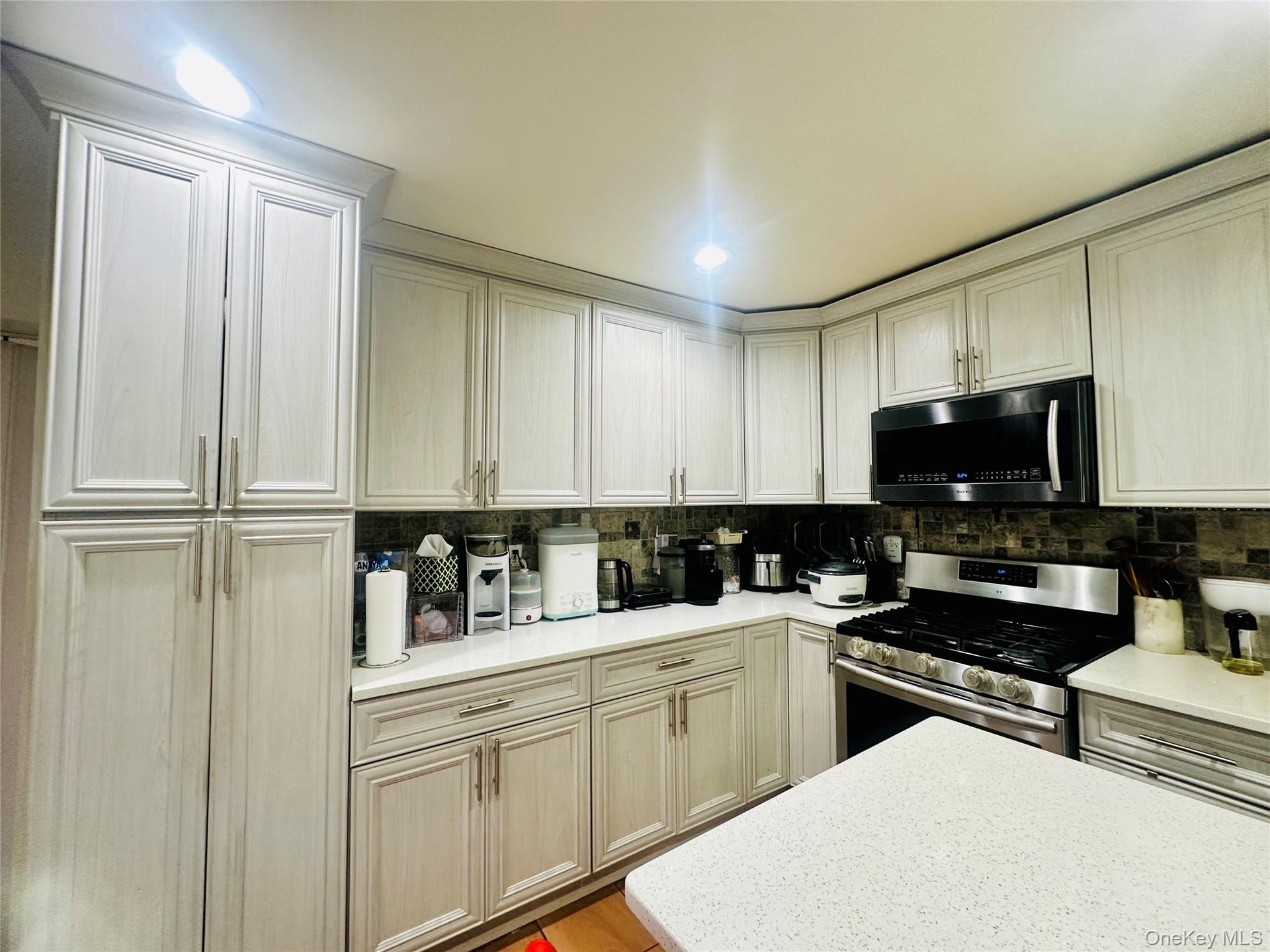 - Kitchen with stainless steel appliances, light countertops, decorative backsplash, and light wood finished floors