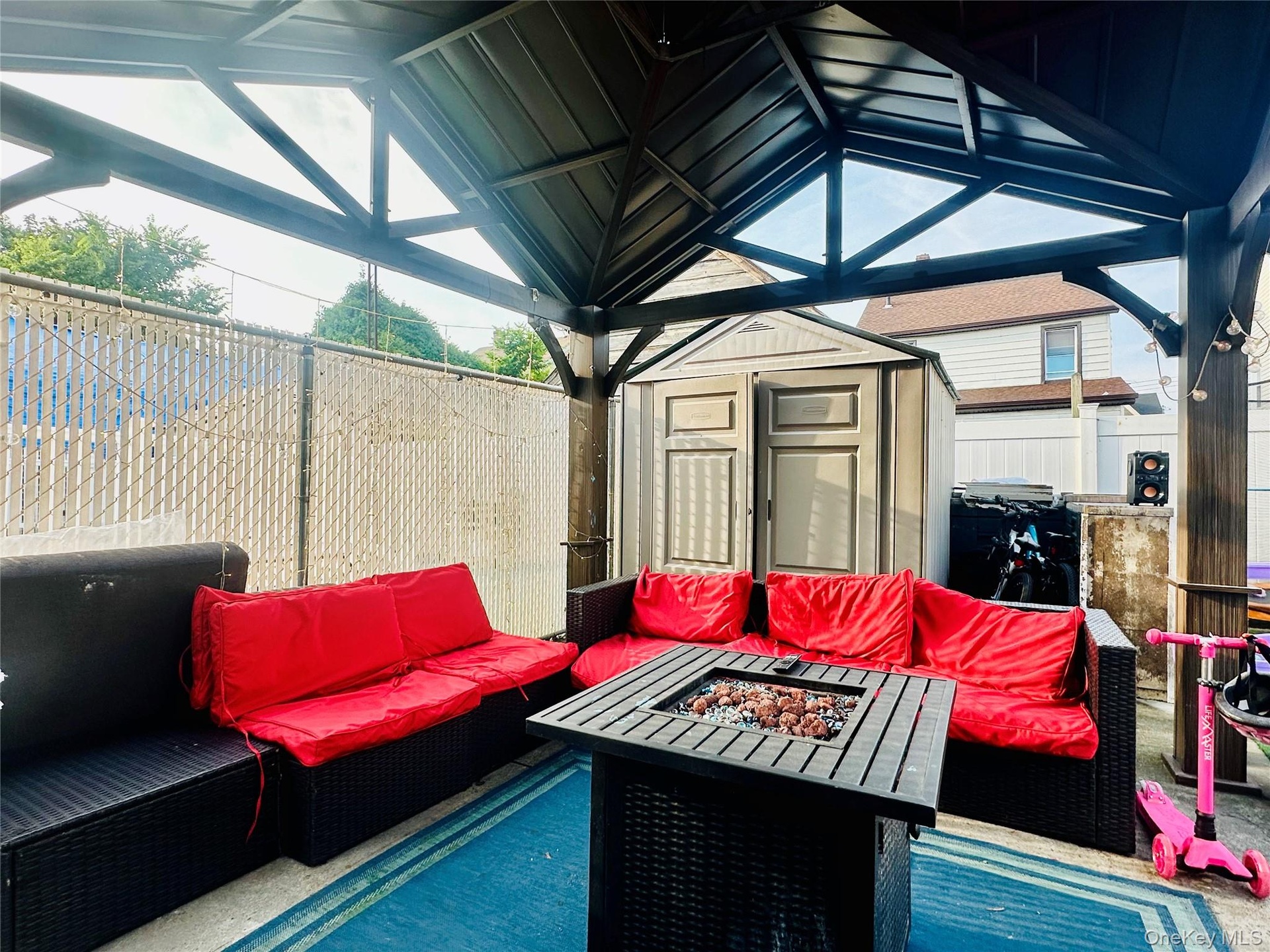 - View of patio / terrace with an outdoor living space with a fire pit and a shed