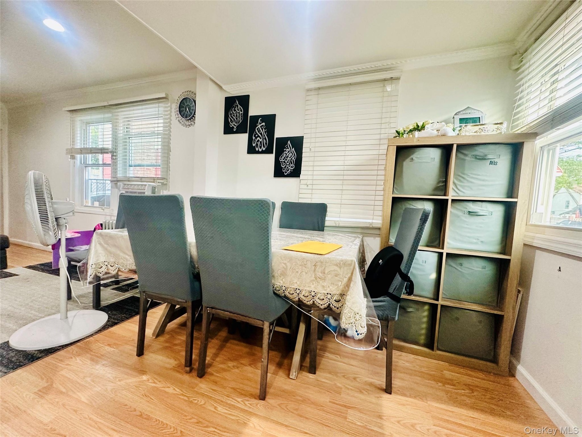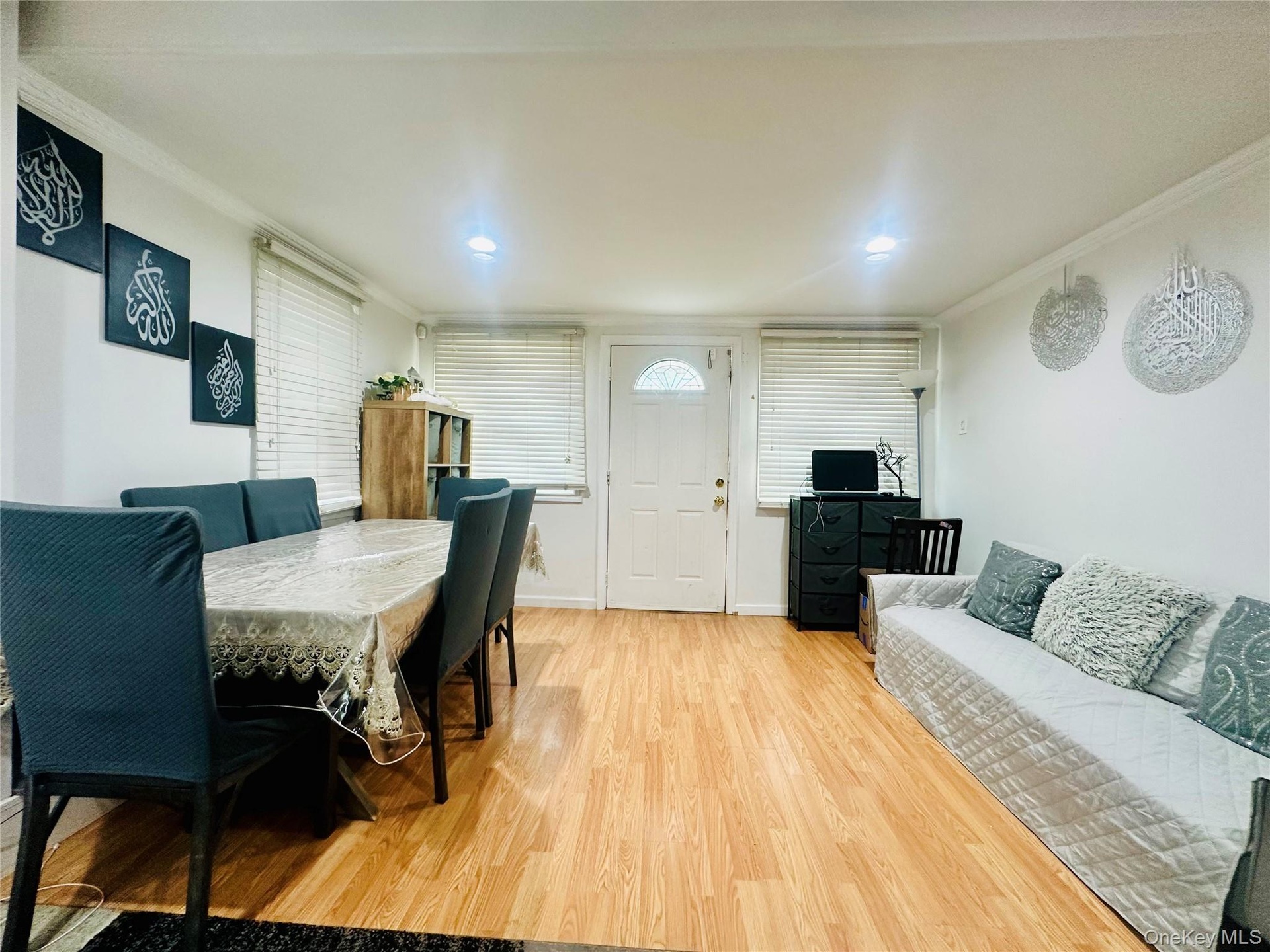 - Living area with crown molding, wood finished floors, and recessed lighting