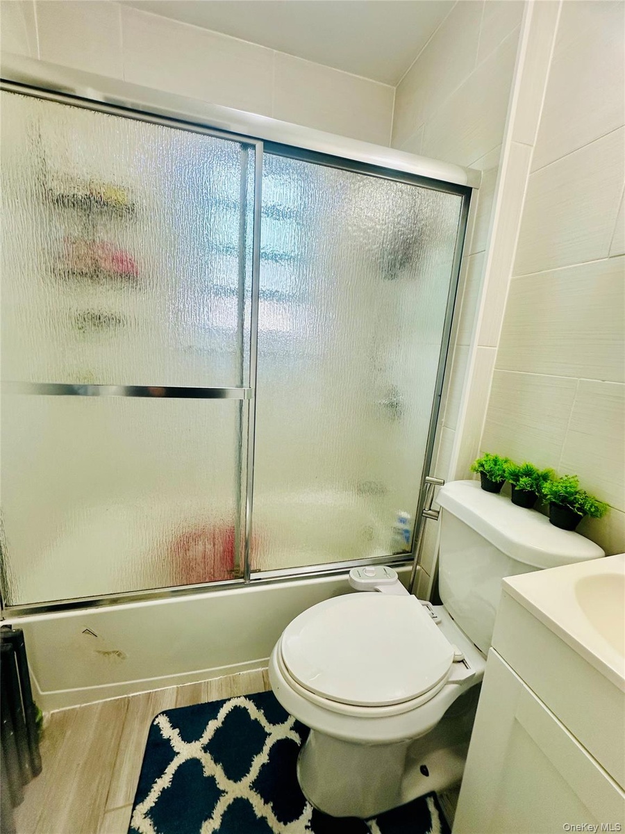 - Bathroom featuring vanity, shower / bath combination with glass door, tile walls, and wood finished floors