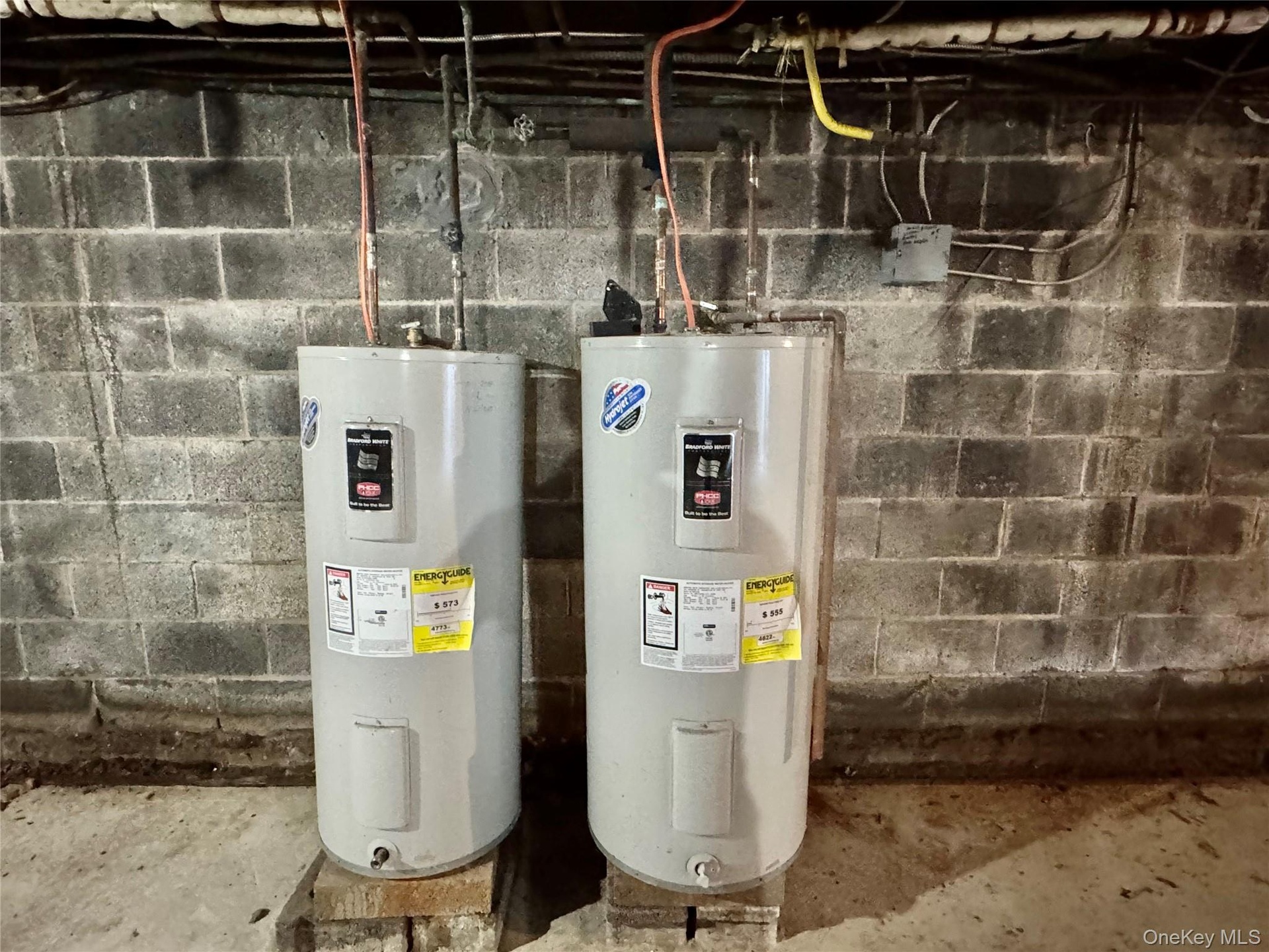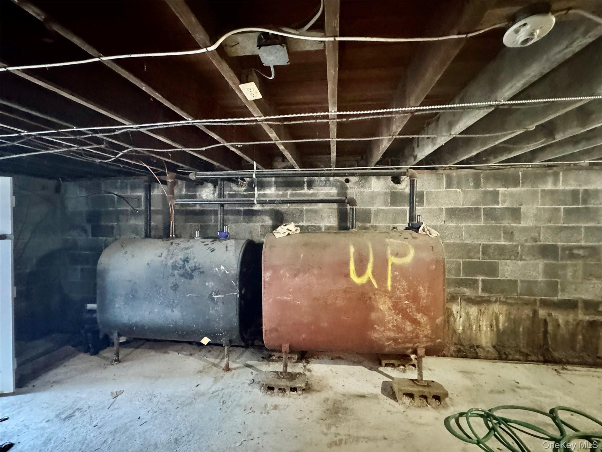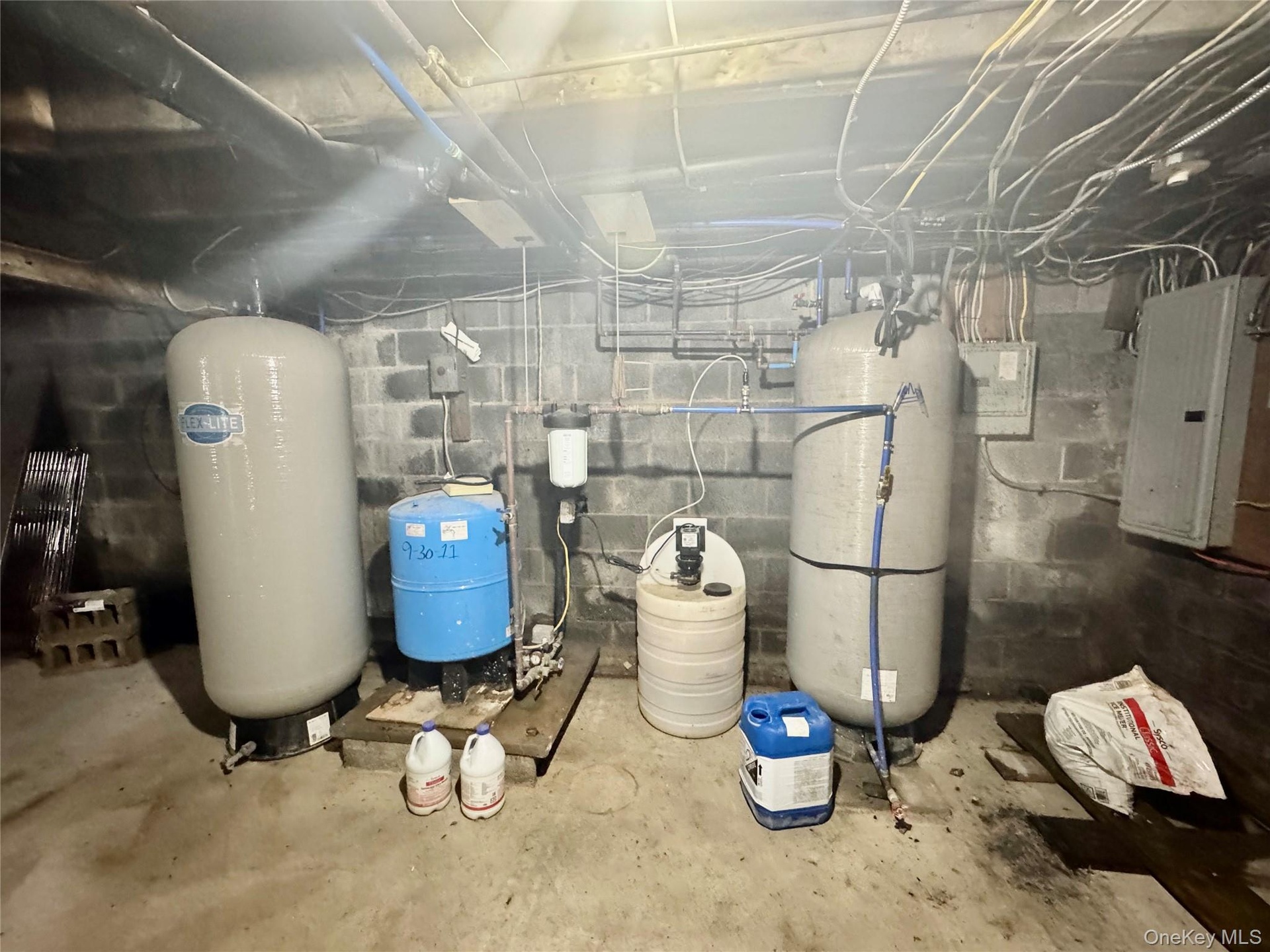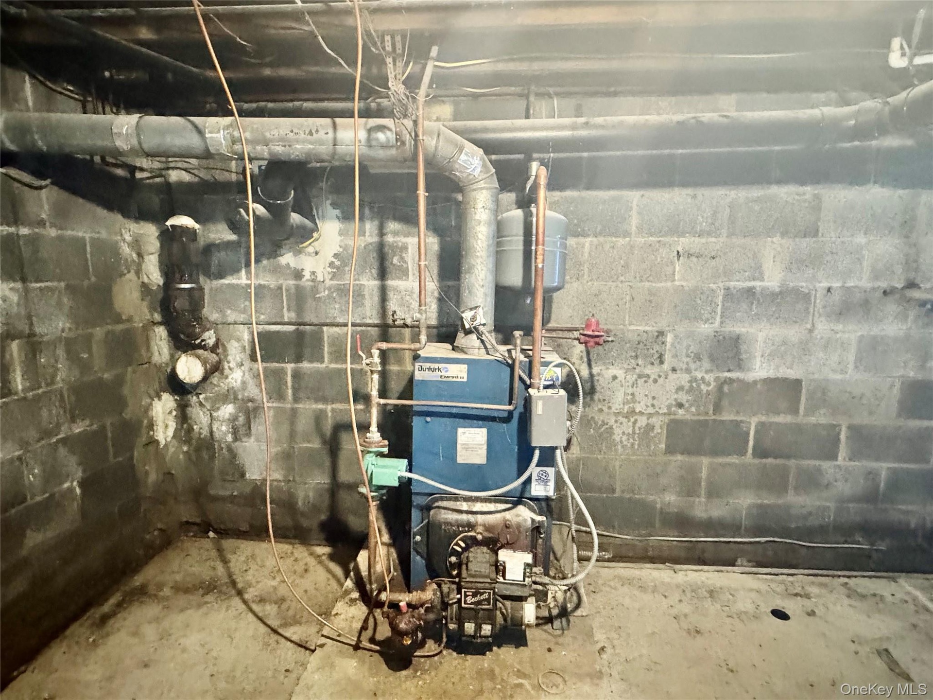 - Unfinished basement featuring a heating unit, water heater, a water pressure tank, and drainage system