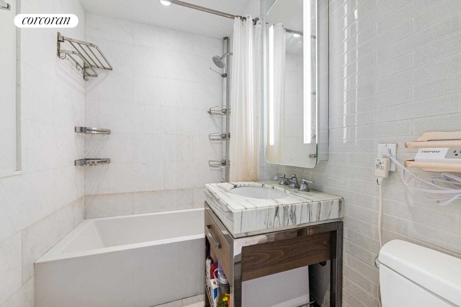 The open concept kitchen features custom Italian lacquer finished cabinetry and top-of-the-line integrated Miele appliances including a fully paneled Miele refrigerator, and white marble countertops and backsplash. The spa-like bathroom offers Dolomoite marble floors, a custom Italian grey oak vanity, a deep soaking tub, and a Toto toilet with a bidet. An in unit washer and dryer, and ample closet space complete the apartment giving all the comforts of modern luxury.