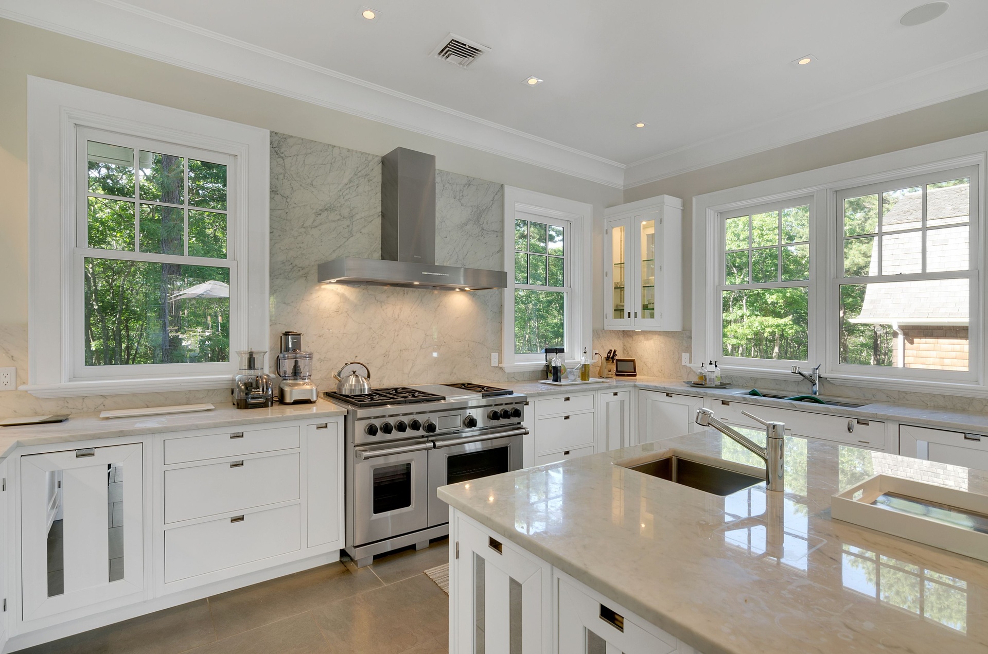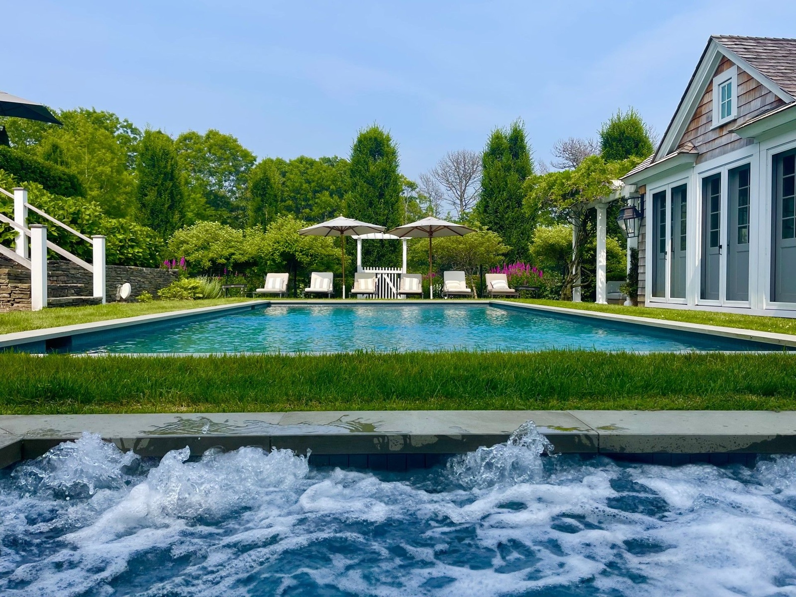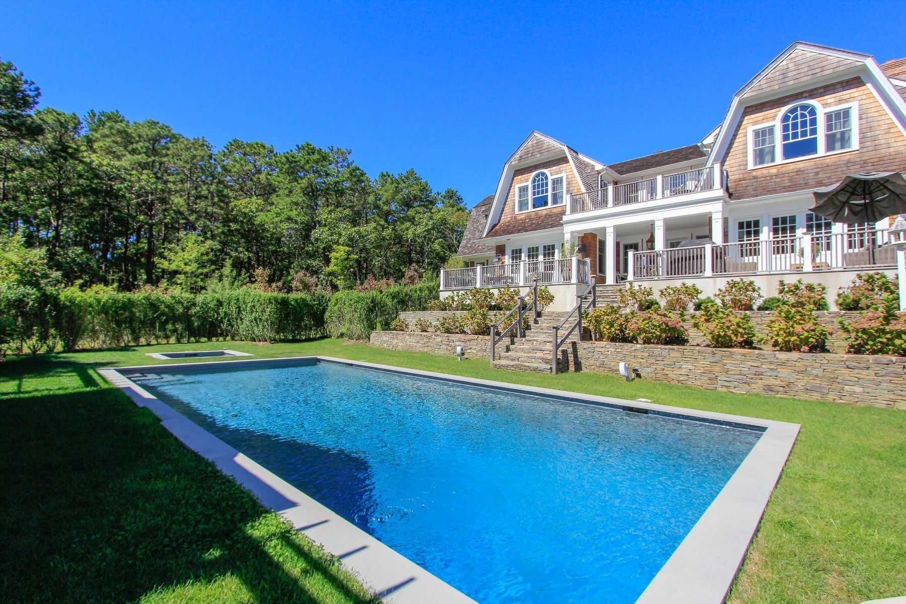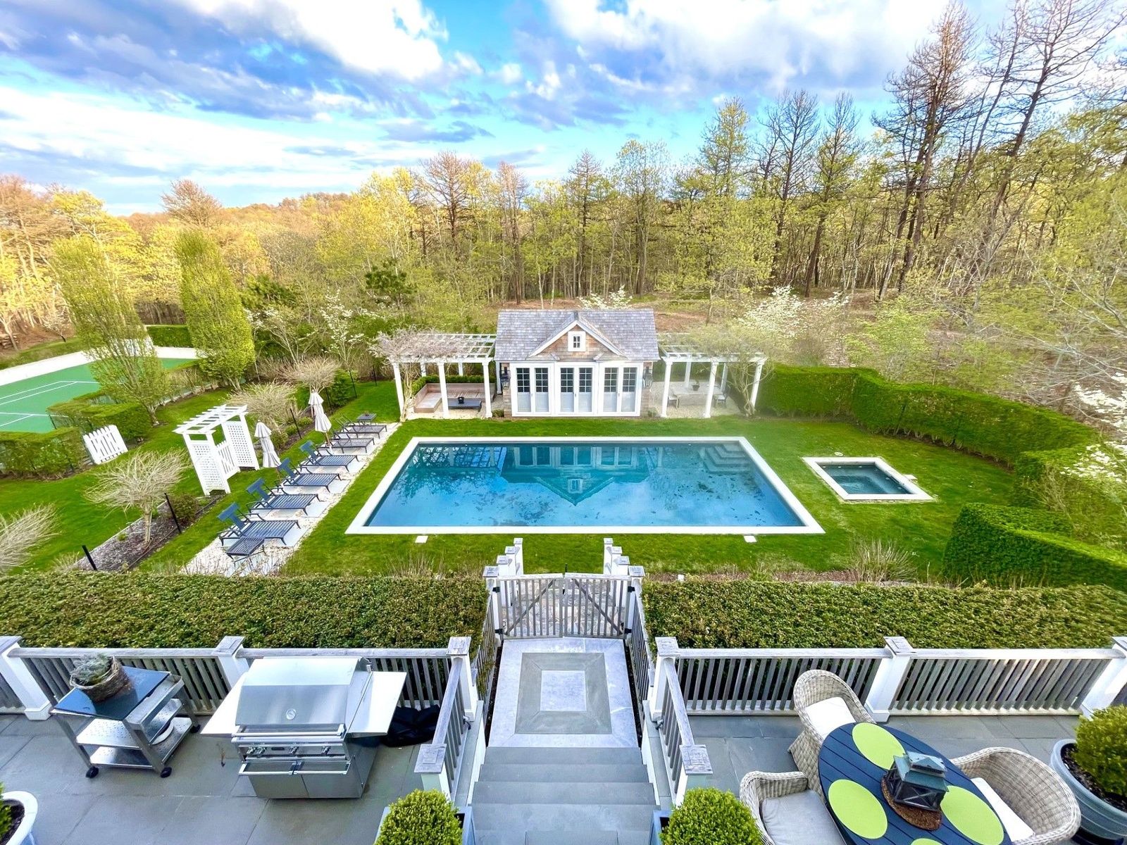 Enjoy this stylish home perched on a hill with immaculate finishes throughout. Gourmet kitchen with Sub Zero/ Wolf appliances opens to eat in casual dining area with fireplace and open living space with doors to the Italian stone balcony that stretches across the front of the home overlooking the pool, hot tub, tennis and gardens. There is also a formal dining room fit for kings. First floor also features a large living room with fireplace, den area, bathrooms and a 1st floor ensuite bedroom with doors to garden. The second floor features a master with a bathroom that will take your breath away, the additional bedrooms all have baths. In the basement - tiled with white porcelain there is a media room with sofas and big movie size screen, extensive gym area, sauna and steam room.