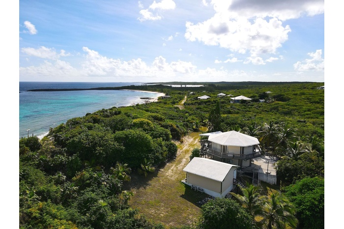From the upper deck of your secluded home elevated on a hill, enjoy the sunrise over Turtle Cove Bay and the Atlantic Ocean, and later, the sunset over the hills to the west. This Topsider home was built in the USA with the “tropical package”, is engineered to “cat 5” hurricanes. The home features an upper level for the Owners and a lower level guest suite. Each level is complete with a living area, kitchen and dining space, bedroom with w/i closets, and bathroom, plus plenty of outdoor living space on wrap-around decks. Both levels are finished in durable cypress T&G on the walls and ceilings, ceramic tile flooring, and vinyl-clad double-pane windows; each level has its own split system air conditioner and water heater. There is a large 17,000-gallon rainwater cistern. The property includes a double-car garage and a boat/garden shed. Beautiful coconut trees and other mature trees are on the property. Included are most furnishings and all kitchen appliances, washer and dryer. Turtle Cove beach is just a few steps away, and a short 1⁄2 mile walk to Dean's Blue Hole.