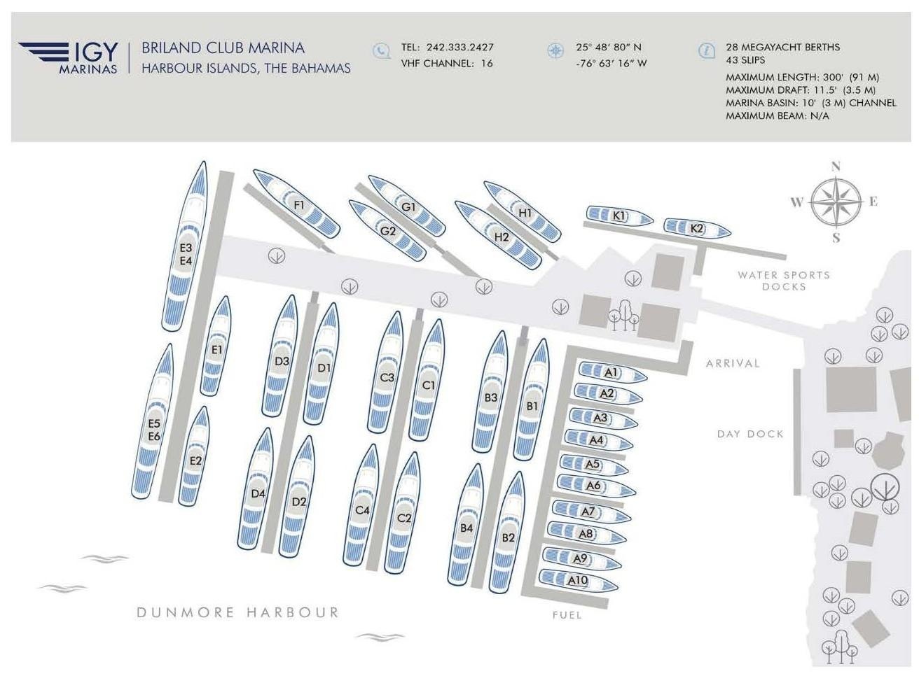 Welcome to Briland Club, Harbour Island’s most exclusive enclave and the proud home of the island’s first and only megayacht marina. Here, effortless luxury meets barefoot ease, inviting family and friends to gather, celebrate, and craft memories that last a lifetime. Slip accommodations range from under 80 feet to an impressive 300 feet and are offered exclusively alongside real-estate ownership and a private club membership, ensuring a rare harmony between land and sea. Among the premier offerings, Slip B3 provides 150 linear feet, perfectly suited for those seeking generous space and direct access to world-class service and amenities. Every detail of the full-service marina has been designed for seamless living: 15-foot-wide IPE-clad floating docks provide independent water and power, while in-slip fueling, waste pump-out, concierge dockmaster service, and dedicated crew amenities make each arrival as smooth as the turquoise waters that surround you.