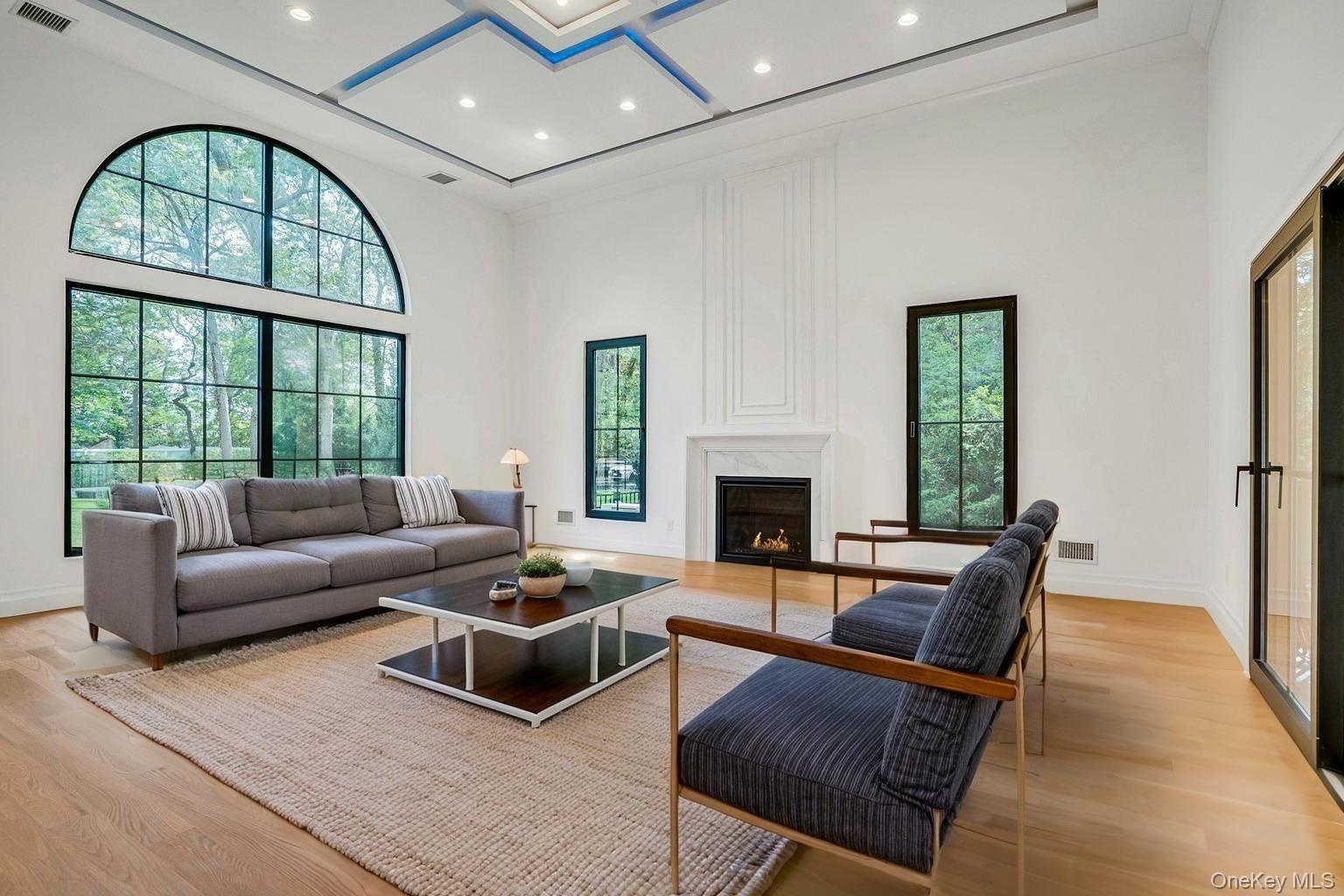 - Living area with healthy amount of natural light, coffered ceiling, recessed lighting, light wood-style floors, and a high end fireplace