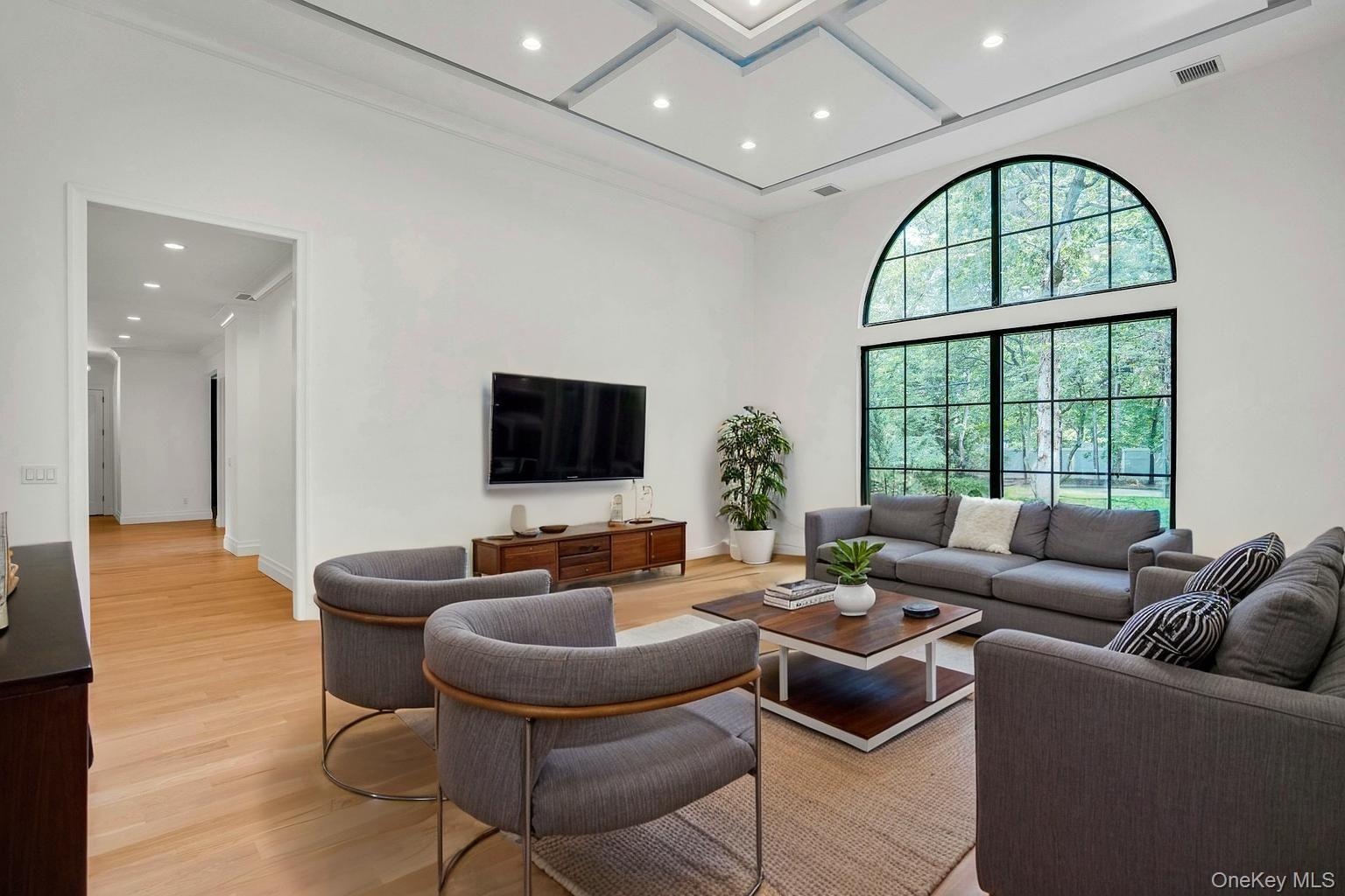 - Living area featuring coffered ceiling, light wood finished floors, recessed lighting, beam ceiling, and a high ceiling